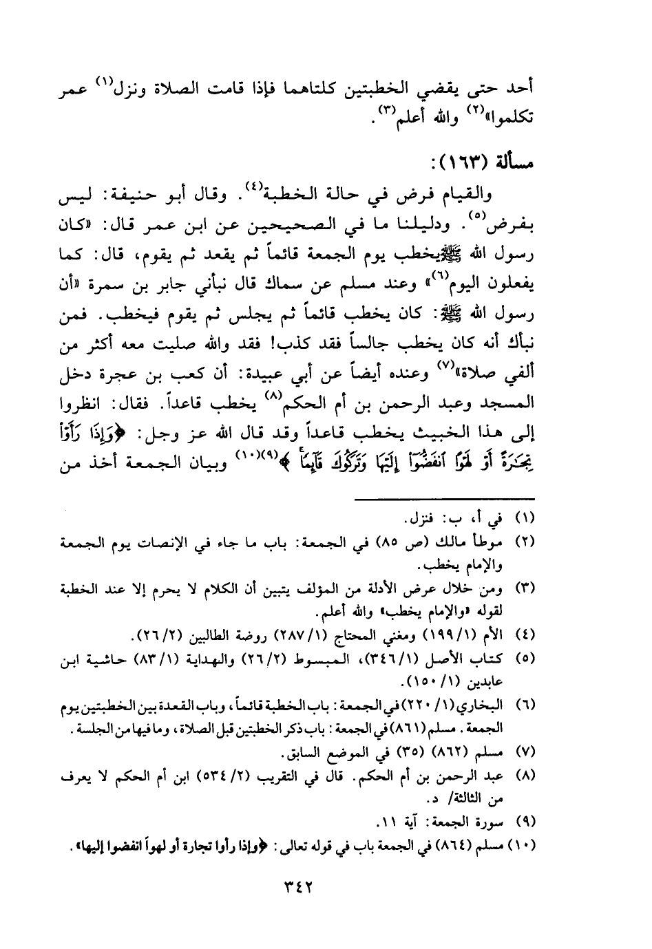وَالْقِيَام فرض فِي حَالَة الْخطْبَة. وَقَالَ أَبُو حنيفَة: لَيْسَ بِفَرْض. وَدَلِيلنَا مَا فِي الصَّحِيحَيْنِ عَن ابْن عمر قَالَ: " كَانَ رَسُول الله - صَلَّى اللَّهُ عَلَيْهِ وَسَلَّم َ - يخْطب يَوْم الْجُمُعَة قَائِما ثمَّ يقْعد ثمَّ يقوم، قَالَ: كَمَا يَفْعَلُونَ الْيَوْم " وَعند مُسلم عَن سماك قَالَ نَبَّأَنِي جَابر بن سَمُرَة " أَن رَسُول الله - صَلَّى اللَّهُ عَلَيْهِ وَسَلَّم َ -: كَانَ يخْطب قَائِما ثمَّ يجلس ثمَّ يقوم فيخطب. فَمن نبأك أَنه كَانَ يخْطب جَالِسا فقد كذب! فقد وَالله صليت مَعَه أَكثر من ألفي صَلَاة " وَعِنْده أَيْضا عَن أبي عُبَيْدَة: أَن كَعْب بن عجْرَة دخل الْمَسْجِد وَعبد الرَّحْمَن بن أم الحكم يخْطب قَاعِدا. فَقَالَ: انْظُرُوا إِلَى هَذَا الْخَبيث يخْطب قَاعِدا وَقد قَالَ الله عز وَجل: {وَإِذا رَأَوْا تِجَارَة أَو لهوا انْفَضُّوا إِلَيْهَا وَتَرَكُوك قَائِما} وَبَيَان الْجُمُعَة أَخذ من