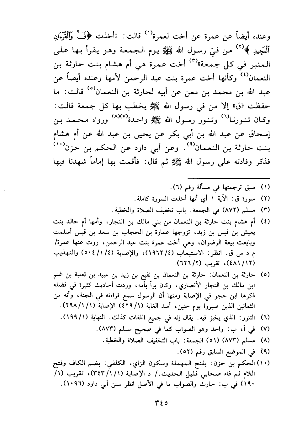 وَعِنْده أَيْضا عَن عمْرَة عَن أُخْت لعمرة قَالَت " أخذت {ق وَالْقُرْآن الْمجِيد} من فيّ رَسُول الله - صَلَّى اللَّهُ عَلَيْهِ وَسَلَّم َ - يَوْم الْجُمُعَة وَهُوَ يقْرَأ بهَا على الْمِنْبَر فِي كل جُمُعَة " أُخْت عمْرَة هِيَ أم هِشَام بنت حَارِثَة بن النُّعْمَان وَكَأَنَّهَا أُخْت عمْرَة بنت عبد الرَّحْمَن لأمها وَعِنْده أَيْضا عَن عبد الله بن مُحَمَّد بن معن عَن أَبِيه لحارثة بن النُّعْمَان قَالَت: مَا حفظت " ق " إِلَّا من فيّ رَسُول الله - صَلَّى اللَّهُ عَلَيْهِ وَسَلَّم َ - يخْطب بهَا كل جُمُعَة قَالَت: وَكَانَ تنورنا وتنور رَسُول الله - صَلَّى اللَّهُ عَلَيْهِ وَسَلَّم َ - وَاحِدَة وَرَوَاهُ مُحَمَّد بن إِسْحَاق عَن عبد الله بن أبي بكر عَن يحيى بن عبد الله عَن أم هِشَام بنت حَارِثَة بن النُّعْمَان. وَعَن أبي دَاوُد عَن الحكم بن حزن فَذكر وفادته على رَسُول الله - صَلَّى اللَّهُ عَلَيْهِ وَسَلَّم َ - ثمَّ قَالَ: فأقمت بهَا إِمَامًا شَهِدنَا فِيهَا