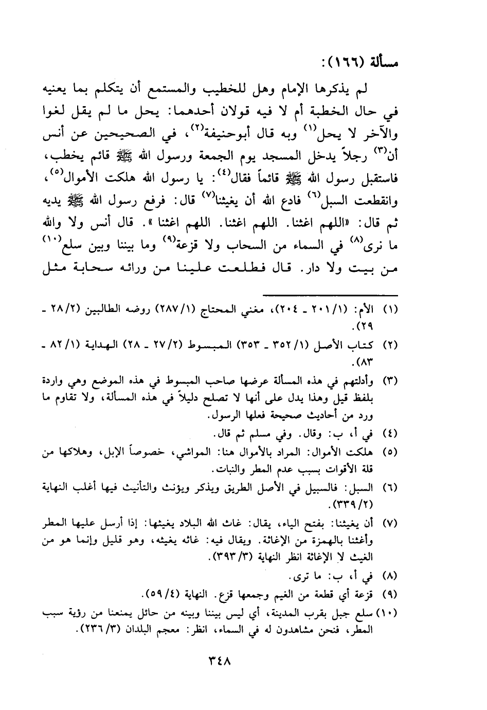 لم يذكرهَا الإِمَام وَهل للخطيب والمستمع أَن يتَكَلَّم بِمَا يعنيه فِي حَال الْخطْبَة أم لَا فِيهِ قَولَانِ أَحدهمَا: يحل مَا لم يقل لَغوا وَالْآخر لَا يحل وَبِه قَالَ أَبُو حنيفَة، فِي الصَّحِيحَيْنِ عَن أنس أَن رجلا يدْخل الْمَسْجِد يَوْم الْجُمُعَة وَرَسُول الله - صَلَّى اللَّهُ عَلَيْهِ وَسَلَّم َ - قَائِم يخْطب، فَاسْتقْبل رَسُول الله - صَلَّى اللَّهُ عَلَيْهِ وَسَلَّم َ - قَائِما فَقَالَ: يَا رَسُول الله هَلَكت الْأَمْوَال، وانقطعت السبل فَادع الله أَن يغيثنا قَالَ: فَرفع رَسُول الله - صَلَّى اللَّهُ عَلَيْهِ وَسَلَّم َ - يَدَيْهِ ثمَّ قَالَ: " اللَّهُمَّ اغثنا. اللَّهُمَّ اغثنا. اللَّهُمَّ اغثنا ". قَالَ أنس وَلَا وَالله مَا نرى فِي السَّمَاء من السَّحَاب وَلَا قزعة وَمَا بَيْننَا وَبَين سلع من بَيت وَلَا دَار. قَالَ فطلعت علينا من وَرَائه سَحَابَة مثل