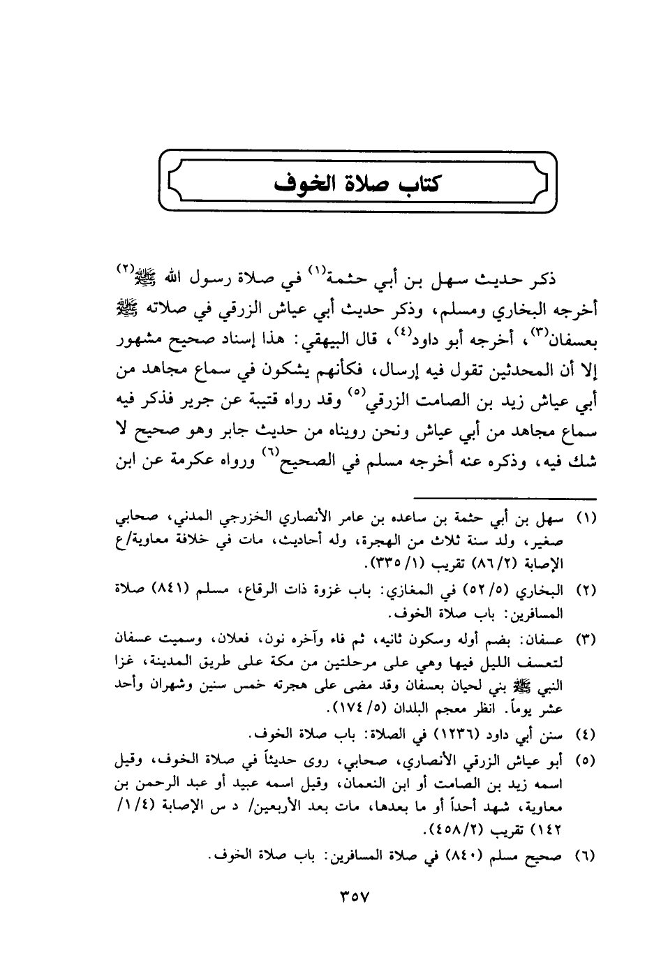 ذكر حَدِيث سهل بن أبي حثْمَة فِي صَلَاة رَسُول الله - صَلَّى اللَّهُ عَلَيْهِ وَسَلَّم َ - أخرجه البُخَارِيّ وَمُسلم، وَذكر حَدِيث أبي عَيَّاش الزرقي فِي صلَاته - صَلَّى اللَّهُ عَلَيْهِ وَسَلَّم َ - بعسفان، أخرجه أَبُو دَاوُد، قَالَ الْبَيْهَقِيّ: هَذَا إِسْنَاد صَحِيح مَشْهُور إِلَّا أَن الْمُحدثين تَقول فِيهِ إرْسَال، فكأنهم يَشكونَ فِي سَماع مُجَاهِد من أبي عَيَّاش زيد بن الصَّامِت الزرقي وَقد رَوَاهُ قُتَيْبَة عَن جرير فَذكر فِيهِ سَماع مُجَاهِد من أبي عَيَّاش وَنحن روينَاهُ من حَدِيث جَابر وَهُوَ صَحِيح لَا شكّ فِيهِ، وَذكره عَنهُ أخرجه مُسلم فِي الصَّحِيح وَرَوَاهُ عِكْرِمَة عَن ابْن