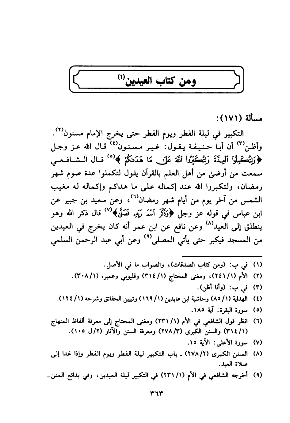 التَّكْبِير فِي لَيْلَة الْفطر وَيَوْم الْفطر حَتَّى يخرج الإِمَام مسنون. وأظن أَن أَبَا حنيفَة يَقُول: غير مسنون قَالَ الله عز وَجل {ولتكملوا الْعدة ولتكبروا الله على مَا هدَاكُمْ} قَالَ الشَّافِعِي سَمِعت من أرْضى من أهل الْعلم بِالْقُرْآنِ يَقُول لتكملوا عدَّة صَوْم شهر رَمَضَان، ولتكبروا الله عِنْد إكماله على مَا هدَاكُمْ وإكماله لَهُ مغيب الشَّمْس من آخر يَوْم من أَيَّام شهر رَمَضَان، وَعَن سعيد بن جُبَير عَن ابْن عَبَّاس فِي قَوْله عز وَجل {وَذكر اسْم ربه فصلى} قَالَ ذكر الله وَهُوَ ينْطَلق إِلَى الْعِيد وَعَن نَافِع عَن ابْن عمر أَنه كَانَ يخرج فِي الْعِيدَيْنِ من الْمَسْجِد فيكبر حَتَّى يَأْتِي الْمصلى وَعَن أبي عبد الرَّحْمَن السّلمِيّ