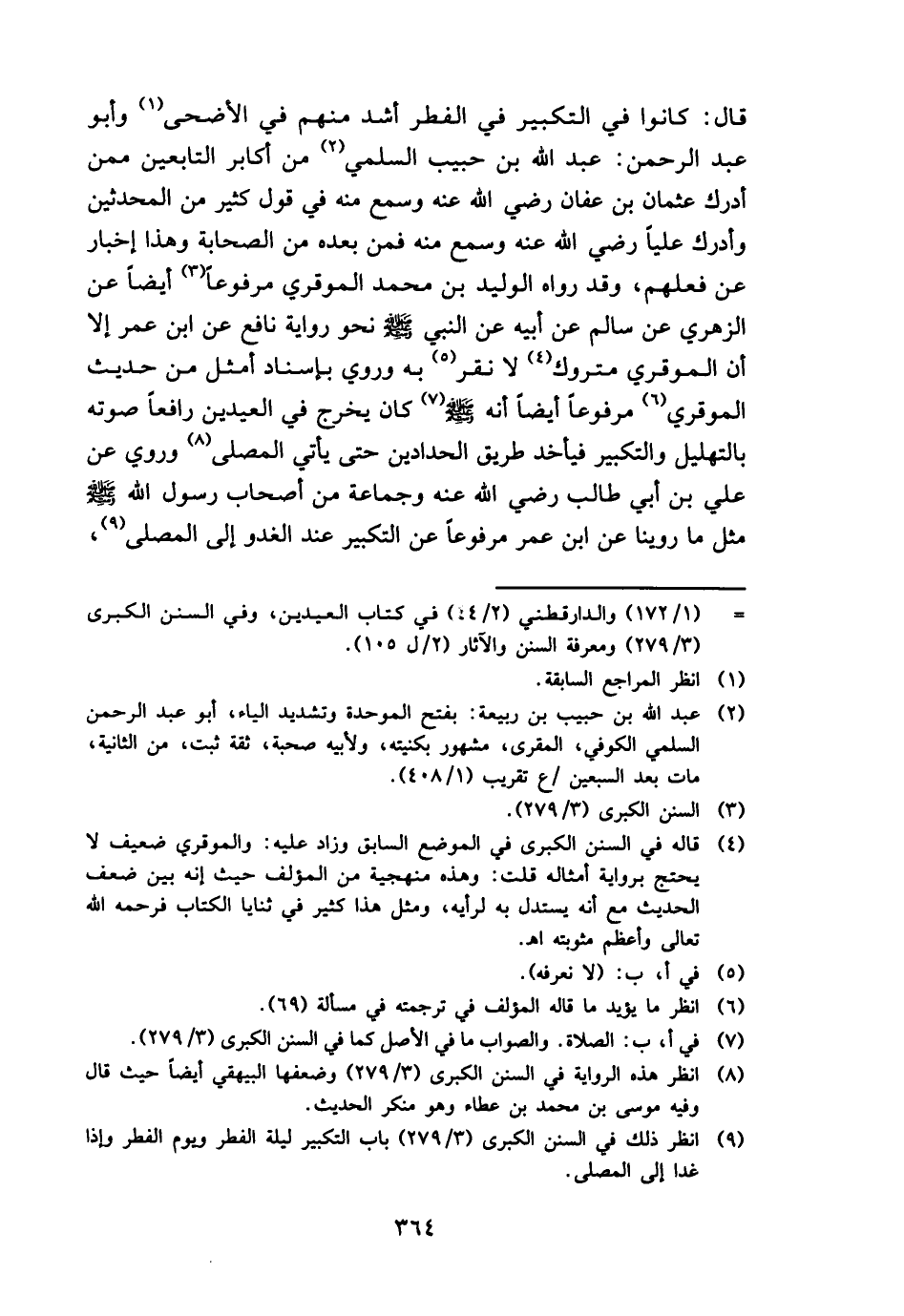 قَالَ: كَانُوا فِي التَّكْبِير فِي الْفطر أَشد مِنْهُم فِي الْأَضْحَى وَأَبُو عبد الرَّحْمَن: عبد الله بن حبيب السّلمِيّ من أكَابِر التَّابِعين مِمَّن أدْرك عُثْمَان بن عَفَّان رَضِي الله عَنهُ وَسمع مِنْهُ فِي قَول كثير من الْمُحدثين وَأدْركَ عليا رَضِي الله عَنهُ وَسمع مِنْهُ فَمن بعده من الصَّحَابَة وَهَذَا إِخْبَار عَن فعلهم، وَقد رَوَاهُ الْوَلِيد بن مُحَمَّد الموقري مَرْفُوعا أَيْضا عَن الزُّهْرِيّ عَن سَالم عَن أَبِيه عَن النَّبِي - صَلَّى اللَّهُ عَلَيْهِ وَسَلَّم َ - نَحْو رِوَايَة نَافِع عَن ابْن عمر إِلَّا أَن الموقري مَتْرُوك لَا نقر بِهِ وَرُوِيَ بِإِسْنَاد أمثل من حَدِيث الموقري مَرْفُوعا أَيْضا أَنه - صَلَّى اللَّهُ عَلَيْهِ وَسَلَّم َ - كَانَ يخرج فِي الْعِيدَيْنِ رَافعا صَوته بالتهليل وَالتَّكْبِير فَيَأْخُذ طَرِيق الحدادين حَتَّى يَأْتِي الْمصلى وَرُوِيَ عَن عَليّ بن أبي طَالب رَضِي الله عَنهُ وَجَمَاعَة من أَصْحَاب رَسُول الله - صَلَّى اللَّهُ عَلَيْهِ وَسَلَّم َ - مثل مَا روينَا عَن ابْن عمر مَرْفُوعا عَن التَّكْبِير عِنْد الغدو إِلَى الْمصلى،