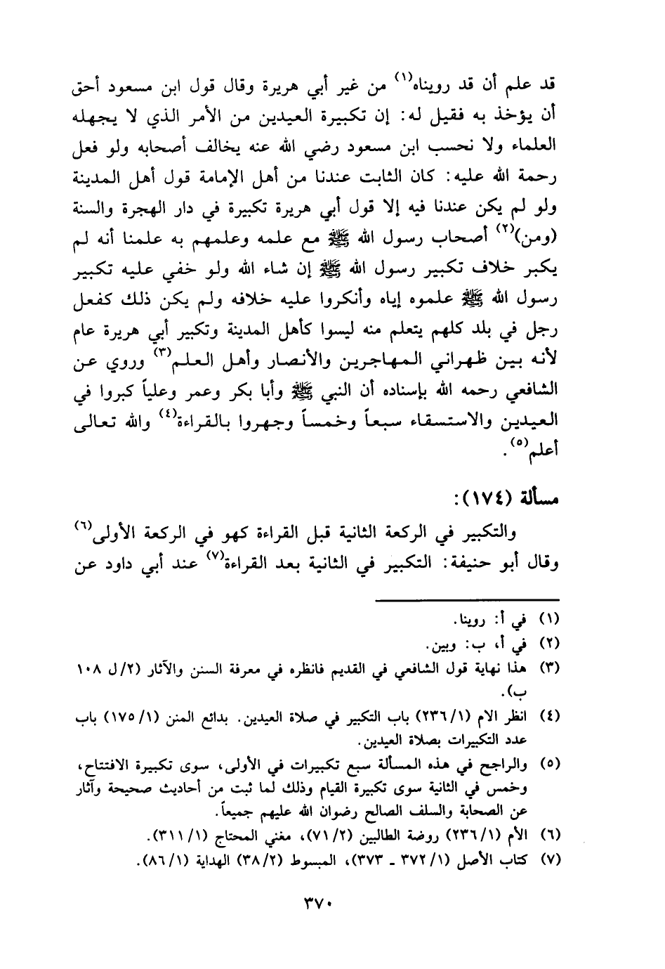قد علم أَن قد روينَاهُ من غير أبي هُرَيْرَة وَقَالَ قَول ابْن مَسْعُود أَحَق أَن يُؤْخَذ بِهِ فَقيل لَهُ: إِن تَكْبِيرَة الْعِيدَيْنِ من الْأَمر الَّذِي لَا يجهله الْعلمَاء وَلَا نحسب ابْن مَسْعُود رَضِي الله عَنهُ يُخَالف أَصْحَابه وَلَو فعل رَحْمَة الله عَلَيْهِ: كَانَ الثَّابِت عندنَا من أهل الْإِمَامَة قَول أهل الْمَدِينَة وَلَو لم يكن عندنَا فِيهِ إِلَّا قَول أبي هُرَيْرَة تَكْبِيرَة فِي دَار الْهِجْرَة وَالسّنة (وَمن) أَصْحَاب رَسُول الله - صَلَّى اللَّهُ عَلَيْهِ وَسَلَّم َ - مَعَ علمه وعلمهم بِهِ علمنَا أَنه لم يكبر خلاف تَكْبِير رَسُول الله - صَلَّى اللَّهُ عَلَيْهِ وَسَلَّم َ - إِن شَاءَ الله وَلَو خَفِي عَلَيْهِ تَكْبِير رَسُول الله - صَلَّى اللَّهُ عَلَيْهِ وَسَلَّم َ - علموه إِيَّاه وأنكروا عَلَيْهِ خِلَافه وَلم يكن ذَلِك كَفعل رجل فِي بلد كلهم يتَعَلَّم مِنْهُ لَيْسُوا كَأَهل الْمَدِينَة وتكبير أبي هُرَيْرَة عَام لِأَنَّهُ بَين ظهراني الْمُهَاجِرين وَالْأَنْصَار وَأهل الْعلم وَرُوِيَ عَن الشَّافِعِي رَحمَه الله بِإِسْنَادِهِ أَن النَّبِي - صَلَّى اللَّهُ عَلَيْهِ وَسَلَّم َ - وَأَبا بكر وَعمر وعليا كبروا فِي الْعِيدَيْنِ وَالِاسْتِسْقَاء سبعا وخمسا وجهروا بِالْقِرَاءَةِ وَالله تَعَالَى أعلم.