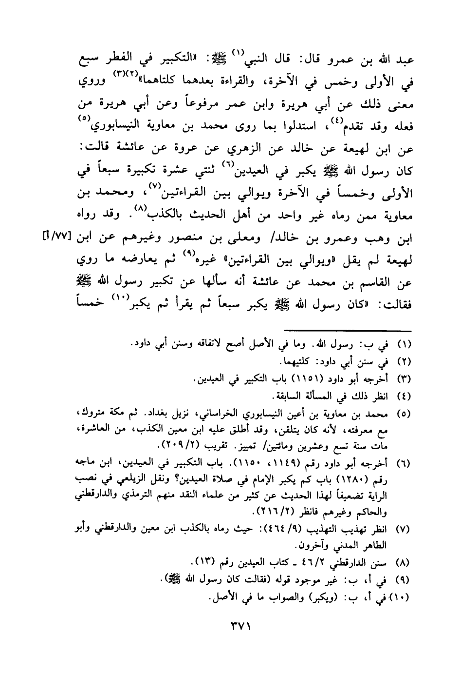عبد الله بن عَمْرو قَالَ: قَالَ النَّبِي - صَلَّى اللَّهُ عَلَيْهِ وَسَلَّم َ -: " التَّكْبِير فِي الْفطر سبع فِي الأولى وَخمْس فِي الْآخِرَة، وَالْقِرَاءَة بعدهمَا كلتاهما " وَرُوِيَ معنى ذَلِك عَن أبي هُرَيْرَة وَابْن عمر مَرْفُوعا وَعَن أبي هُرَيْرَة من فعله وَقد تقدم، استدلوا بِمَا روى مُحَمَّد بن مُعَاوِيَة النَّيْسَابُورِي عَن ابْن لَهِيعَة عَن خَالِد عَن الزُّهْرِيّ عَن عُرْوَة عَن عَائِشَة قَالَت: كَانَ رَسُول الله - صَلَّى اللَّهُ عَلَيْهِ وَسَلَّم َ - يكبر فِي الْعِيدَيْنِ ثِنْتَيْ عشرَة تَكْبِيرَة سبعا فِي الأولى وخمسا فِي الْآخِرَة ويوالي بَين الْقِرَاءَتَيْن، وَمُحَمّد بن مُعَاوِيَة مِمَّن رَمَاه غير وَاحِد من أهل الحَدِيث بِالْكَذِبِ. وَقد رَوَاهُ ابْن وهب وَعَمْرو بن خَالِد / وَمعلى بن مَنْصُور وَغَيرهم عَن ابْن لَهِيعَة لم يقل " ويوالي بَين الْقِرَاءَتَيْن " غَيره ثمَّ يُعَارضهُ مَا رُوِيَ عَن الْقَاسِم بن مُحَمَّد عَن عَائِشَة أَنه سَأَلَهَا عَن تَكْبِير رَسُول الله - صَلَّى اللَّهُ عَلَيْهِ وَسَلَّم َ - فَقَالَت: " كَانَ رَسُول الله - صَلَّى اللَّهُ عَلَيْهِ وَسَلَّم َ - يكبر سبعا ثمَّ يقْرَأ ثمَّ يكبر خمْسا