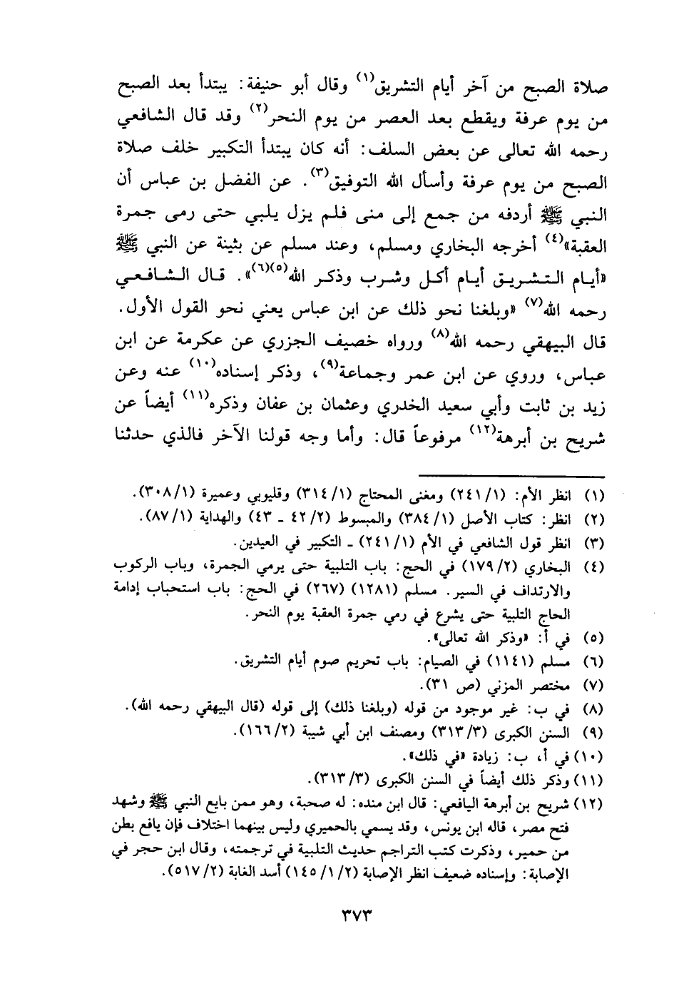 صَلَاة الصُّبْح من آخر أَيَّام التَّشْرِيق وَقَالَ أَبُو حنيفَة: يبتدأ بعد الصُّبْح من يَوْم عَرَفَة وَيقطع بعد الْعَصْر من يَوْم النَّحْر وَقد قَالَ الشَّافِعِي رَحمَه الله تَعَالَى عَن بعض السّلف: أَنه كَانَ يبتدأ التَّكْبِير خلف صَلَاة الصُّبْح من يَوْم عَرَفَة وأسأل الله التَّوْفِيق. عَن الْفضل بن عَبَّاس أَن النَّبِي - صَلَّى اللَّهُ عَلَيْهِ وَسَلَّم َ - أردفه من جمع إِلَى منى فَلم يزل يُلَبِّي حَتَّى رمى جَمْرَة الْعقبَة " أخرجه البُخَارِيّ وَمُسلم، وَعند مُسلم عَن بثينة عَن النَّبِي - صَلَّى اللَّهُ عَلَيْهِ وَسَلَّم َ - " أَيَّام التَّشْرِيق أَيَّام أكل وَشرب وَذكر الله ". قَالَ الشَّافِعِي رَحمَه الله " وبلغنا نَحْو ذَلِك عَن ابْن عَبَّاس يَعْنِي نَحْو القَوْل الأول. قَالَ الْبَيْهَقِيّ رَحمَه الله وَرَوَاهُ خصيف الْجَزرِي عَن عِكْرِمَة عَن ابْن عَبَّاس، وَرُوِيَ عَن ابْن عمر وَجَمَاعَة، وَذكر إِسْنَاده عَنهُ وَعَن زيد بن ثَابت وَأبي سعيد الْخُدْرِيّ وَعُثْمَان بن عَفَّان وَذكره أَيْضا عَن شُرَيْح بن أَبْرَهَة مَرْفُوعا قَالَ: وَأما وَجه قَوْلنَا الآخر فَالَّذِي حَدثنَا