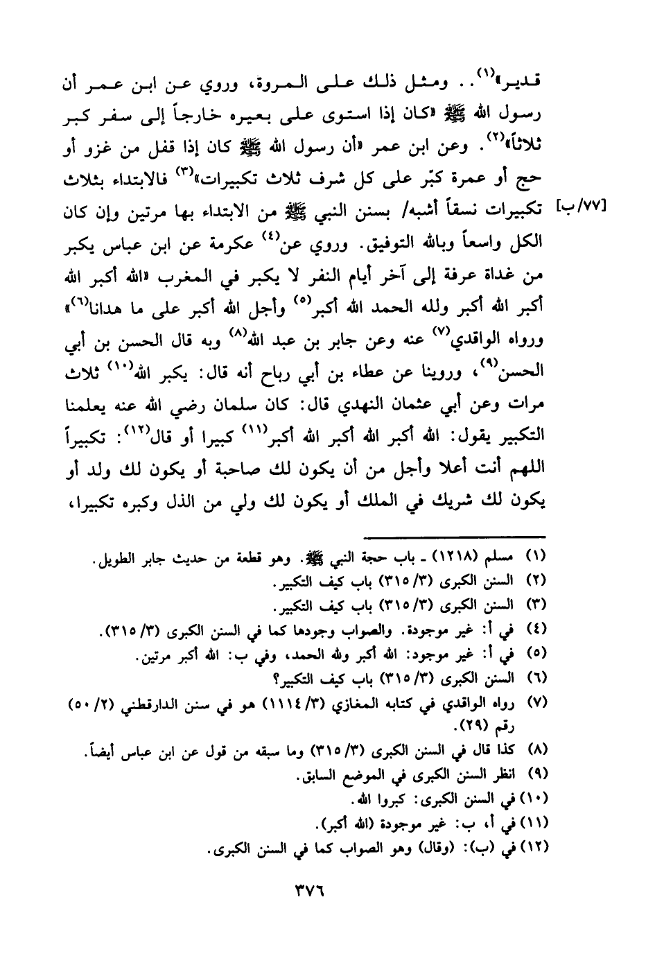 قدير ". . وَمثل ذَلِك على الْمَرْوَة، وَرُوِيَ عَن ابْن عمر أَن رَسُول الله - صَلَّى اللَّهُ عَلَيْهِ وَسَلَّم َ - " كَانَ إِذا اسْتَوَى على بعيره خَارِجا إِلَى سفر كبر ثَلَاثًا ". وَعَن ابْن عمر " أَن رَسُول الله - صَلَّى اللَّهُ عَلَيْهِ وَسَلَّم َ - كَانَ إِذا قفل من غَزْو أَو حج أَو عمْرَة كبر على كل شرف ثَلَاث تَكْبِيرَات " فالابتداء بِثَلَاث تَكْبِيرَات نسقا أشبه / بسنن النَّبِي - صَلَّى اللَّهُ عَلَيْهِ وَسَلَّم َ - من الِابْتِدَاء بهَا مرَّتَيْنِ وَإِن كَانَ الْكل وَاسِعًا وَبِاللَّهِ التَّوْفِيق. وَرُوِيَ عَن عِكْرِمَة عَن ابْن عَبَّاس يكبر من غَدَاة عَرَفَة إِلَى آخر أَيَّام النَّفر لَا يكبر فِي الْمغرب " الله أكبر الله أكبر الله أكبر وَللَّه الْحَمد الله أكبر وَأجل الله أكبر على مَا هدَانَا " وَرَوَاهُ الْوَاقِدِيّ عَنهُ وَعَن جَابر بن عبد الله وَبِه قَالَ الْحسن بن أبي الْحسن، وروينا عَن عَطاء بن أبي رَبَاح أَنه قَالَ: يكبر الله ثَلَاث مَرَّات وَعَن أبي عُثْمَان النَّهْدِيّ قَالَ: كَانَ سلمَان رَضِي الله عَنهُ يعلمنَا التَّكْبِير يَقُول: الله أكبر الله أكبر الله أكبر كَبِيرا أَو قَالَ: تَكْبِيرا اللَّهُمَّ أَنْت أعلا وَأجل من أَن يكون لَك صَاحِبَة أَو يكون لَك ولد أَو يكون لَك شريك فِي الْملك أَو يكون لَك ولي من الذل وَكبره تَكْبِيرا،