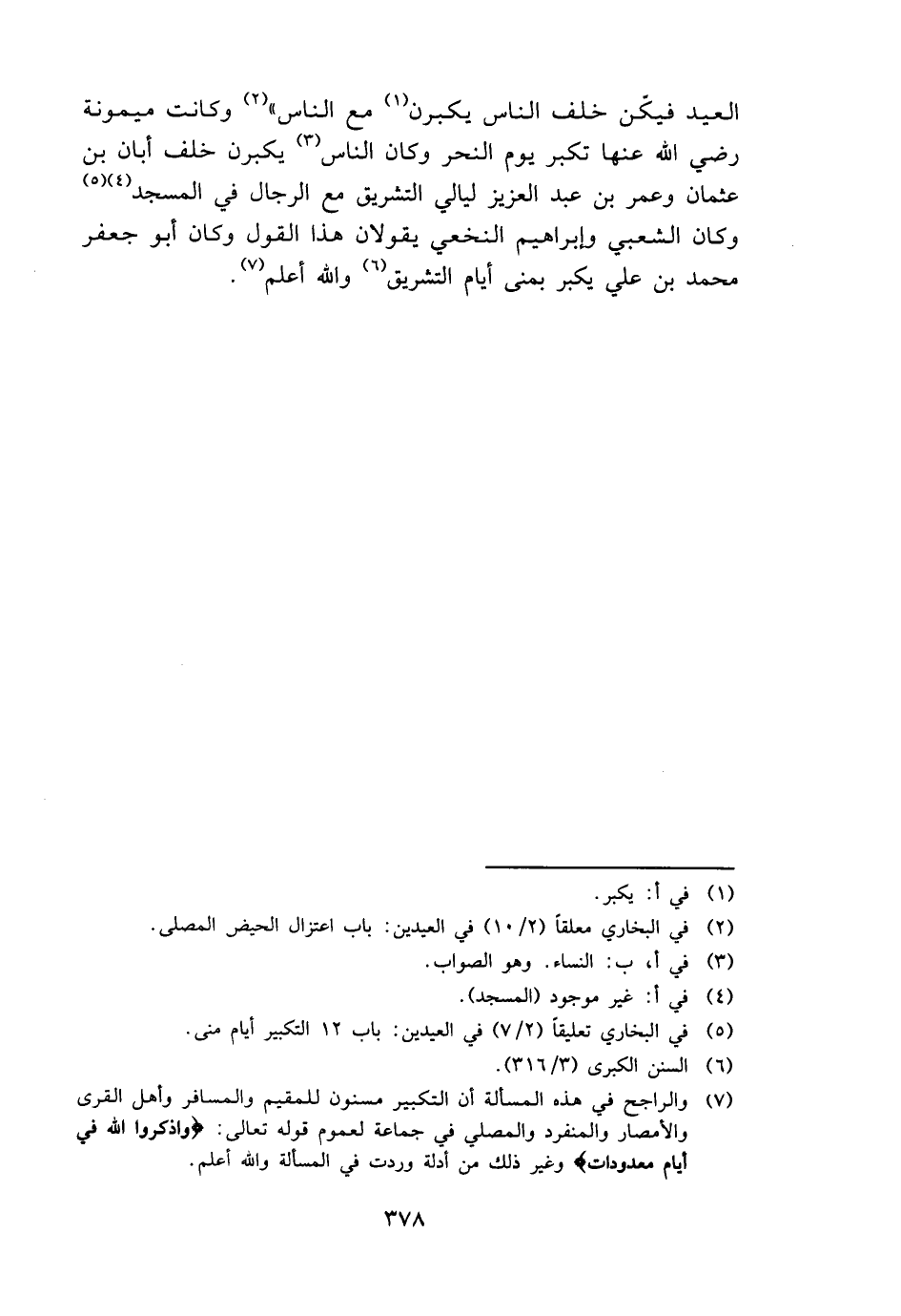 الْعِيد فيكُن خلف النَّاس يكبرن مَعَ النَّاس " وَكَانَت مَيْمُونَة رَضِي الله عَنْهَا تكبر يَوْم النَّحْر وَكَانَ النَّاس يكبرن خلف أبان بن عُثْمَان وَعمر بن عبد الْعَزِيز ليَالِي التَّشْرِيق مَعَ الرِّجَال فِي الْمَسْجِد وَكَانَ الشّعبِيّ وَإِبْرَاهِيم النَّخعِيّ يَقُولَانِ هَذَا القَوْل وَكَانَ أَبُو جَعْفَر مُحَمَّد بن عَليّ يكبر بمنى أَيَّام التَّشْرِيق وَالله أعلم.