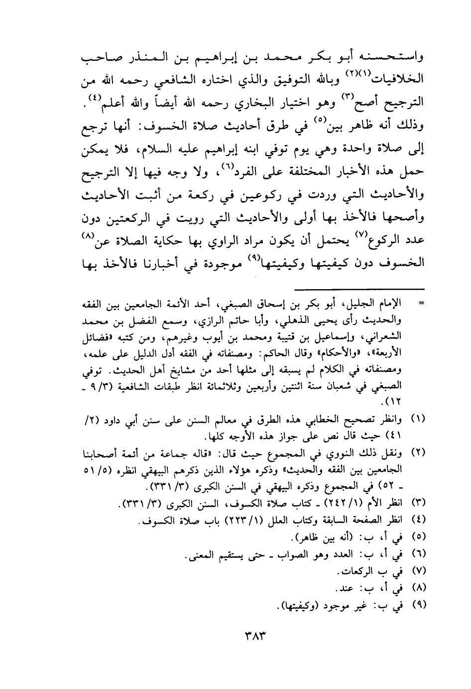 وَاسْتَحْسنهُ أَبُو بكر مُحَمَّد بن إِبْرَاهِيم بن الْمُنْذر صَاحب الخلافيات وَبِاللَّهِ التَّوْفِيق وَالَّذِي اخْتَارَهُ الشَّافِعِي رَحمَه الله من التَّرْجِيح أصح وَهُوَ اخْتِيَار البُخَارِيّ رَحمَه الله أَيْضا وَالله أعلم. وَذَلِكَ أَنه ظَاهر بَين فِي طرق أَحَادِيث صَلَاة الخسوف: أَنَّهَا ترجع إِلَى صَلَاة وَاحِدَة وَهِي يَوْم توفّي ابْنه إِبْرَاهِيم عَلَيْهِ السَّلَام، فَلَا يُمكن حمل هَذِه الْأَخْبَار الْمُخْتَلفَة على الْفَرد، وَلَا وَجه فِيهَا إِلَّا التَّرْجِيح وَالْأَحَادِيث الَّتِي وَردت فِي ركوعين فِي رَكْعَة من أثبت الْأَحَادِيث وأصحها فالأخذ بهَا أولى وَالْأَحَادِيث الَّتِي رويت فِي الرَّكْعَتَيْنِ دون عدد الرُّكُوع يحْتَمل أَن يكون مُرَاد الرَّاوِي بهَا حِكَايَة الصَّلَاة عَن الخسوف دون كيفيتها وكيفيتها مَوْجُودَة فِي أخبارنا فالأخذ بهَا