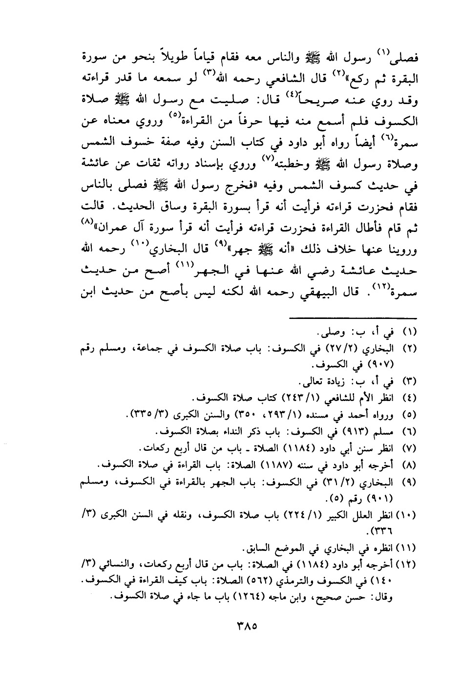فصلى رَسُول الله - صَلَّى اللَّهُ عَلَيْهِ وَسَلَّم َ - وَالنَّاس مَعَه فَقَامَ قيَاما طَويلا بِنَحْوِ من سُورَة الْبَقَرَة ثمَّ ركع " قَالَ الشَّافِعِي رَحمَه الله لَو سَمعه مَا قدر قِرَاءَته وَقد رُوِيَ عَنهُ صَرِيحًا قَالَ: صليت مَعَ رَسُول الله - صَلَّى اللَّهُ عَلَيْهِ وَسَلَّم َ - صَلَاة الْكُسُوف فَلم أسمع مِنْهُ فِيهَا حرفا من الْقِرَاءَة وَرُوِيَ مَعْنَاهُ عَن سَمُرَة أَيْضا رَوَاهُ أَبُو دَاوُد فِي كتاب السّنَن وَفِيه صفة خُسُوف الشَّمْس وَصَلَاة رَسُول الله - صَلَّى اللَّهُ عَلَيْهِ وَسَلَّم َ - وخطبته وَرُوِيَ بِإِسْنَاد رُوَاته ثِقَات عَن عَائِشَة فِي حَدِيث كسوف الشَّمْس وَفِيه " فَخرج رَسُول الله - صَلَّى اللَّهُ عَلَيْهِ وَسَلَّم َ - فصلى بِالنَّاسِ فَقَامَ فحزرت قِرَاءَته فَرَأَيْت أَنه قَرَأَ بِسُورَة الْبَقَرَة وسَاق الحَدِيث. قَالَت ثمَّ قَالَ فَأطَال الْقِرَاءَة فحزرت قِرَاءَته فَرَأَيْت أَنه قَرَأَ سُورَة آل عمرَان " وروينا عَنْهَا خلاف ذَلِك " أَنه - صَلَّى اللَّهُ عَلَيْهِ وَسَلَّم َ - جهر " قَالَ البُخَارِيّ رَحمَه الله حَدِيث عَائِشَة رَضِي الله عَنْهَا فِي الْجَهْر أصح من حَدِيث سَمُرَة. قَالَ الْبَيْهَقِيّ رَحمَه الله لكنه لَيْسَ بأصح من حَدِيث ابْن