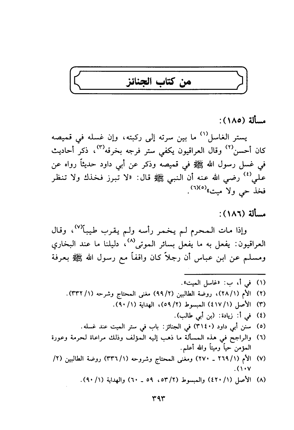 وَإِذا مَاتَ الْمحرم لم يخمر رَأسه وَلم يقرب طيبا، وَقَالَ الْعِرَاقِيُّونَ: يفعل بِهِ مَا يفعل بِسَائِر الْمَوْتَى، دليلنا مَا عِنْد البُخَارِيّ وَمُسلم عَن ابْن عَبَّاس أَن رجلا كَانَ وَاقِفًا مَعَ رَسُول الله - صَلَّى اللَّهُ عَلَيْهِ وَسَلَّم َ - بِعَرَفَة