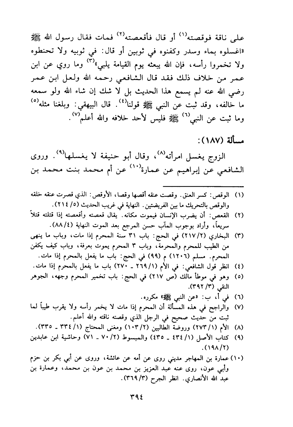 على نَاقَة فوقصته أَو قَالَ فأقعصته فَمَاتَ فَقَالَ رَسُول الله - صَلَّى اللَّهُ عَلَيْهِ وَسَلَّم َ - " اغسلوه بِمَاء وَسدر وكفنوه فِي ثَوْبَيْنِ أَو قَالَ: فِي ثوبيه وَلَا تحنطوه وَلَا تخمروا رَأسه، فَإِن الله يَبْعَثهُ يَوْم الْقِيَامَة يُلَبِّي " وَمَا رُوِيَ عَن ابْن عمر من خلاف ذَلِك فقد قَالَ الشَّافِعِي رَحمَه الله وَلَعَلَّ ابْن عمر رَضِي الله عَنهُ لم يسمع هَذَا الحَدِيث بل لَا شكّ إِن شَاءَ الله وَلَو سَمعه مَا خَالفه، وَقد ثَبت عَن النَّبِي - صَلَّى اللَّهُ عَلَيْهِ وَسَلَّم َ - قَوْلنَا. قَالَ الْبَيْهَقِيّ: وبلغنا مثله وَمَا ثَبت عَن النَّبِي - صَلَّى اللَّهُ عَلَيْهِ وَسَلَّم َ - فَلَيْسَ لأحد خِلَافه وَالله أعلم.