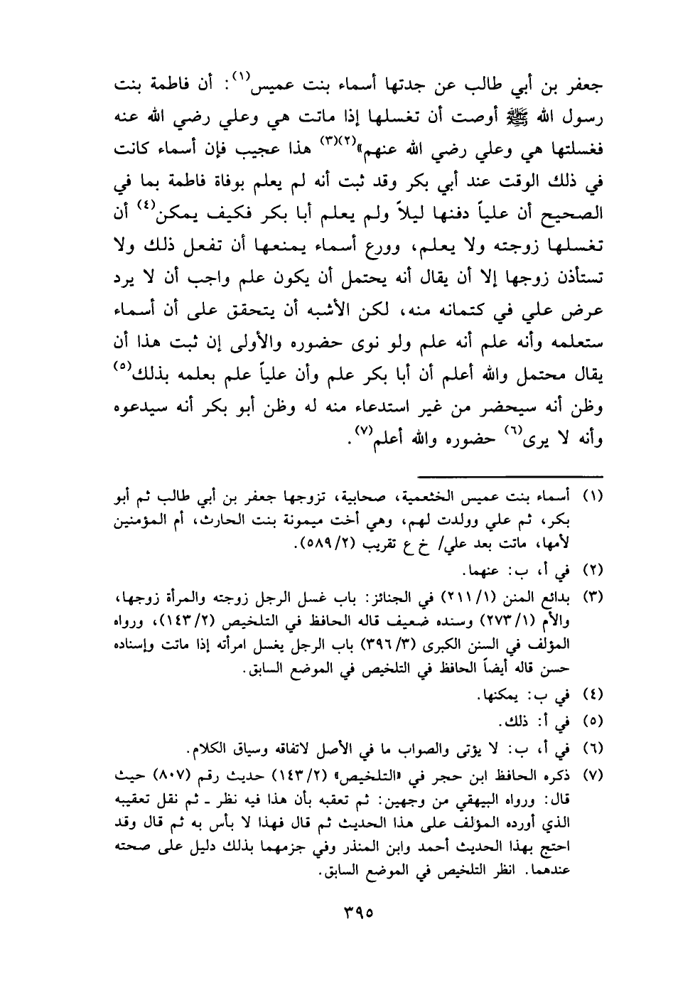 جَعْفَر بن أبي طَالب عَن جدَّتهَا أَسمَاء بنت عُمَيْس: أَن فَاطِمَة بنت رَسُول الله - صَلَّى اللَّهُ عَلَيْهِ وَسَلَّم َ - أوصت أَن تغسلها إِذا مَاتَت هِيَ وَعلي رَضِي الله عَنهُ فغسلتها هِيَ وَعلي رَضِي الله عَنْهُم " هَذَا عَجِيب فَإِن أَسمَاء كَانَت فِي ذَلِك الْوَقْت عِنْد أبي بكر وَقد ثَبت أَنه لم يعلم بوفاة فَاطِمَة بِمَا فِي الصَّحِيح أَن عليا دَفنهَا لَيْلًا وَلم يعلم أَبَا بكر فَكيف يُمكن أَن تغسلها زَوجته وَلَا يعلم، وورع أَسمَاء يمْنَعهَا أَن تفعل ذَلِك وَلَا تستأذن زَوجهَا إِلَّا أَن يُقَال أَنه يحْتَمل أَن يكون علم وَاجِب أَن لَا يرد عرض عَليّ فِي كِتْمَانه مِنْهُ، لَكِن الْأَشْبَه أَن يتَحَقَّق على أَن أَسمَاء ستعلمه وَأَنه علم أَنه علم وَلَو نوى حُضُوره وَالْأولَى إِن ثَبت هَذَا أَن يُقَال مُحْتَمل وَالله أعلم أَن أَبَا بكر علم وَأَن عليا علم بِعِلْمِهِ بذلك وَظن أَنه سيحضر من غير استدعاء مِنْهُ لَهُ وَظن أَبُو بكر أَنه سيدعوه وَأَنه لَا يرى حُضُوره وَالله أعلم.
