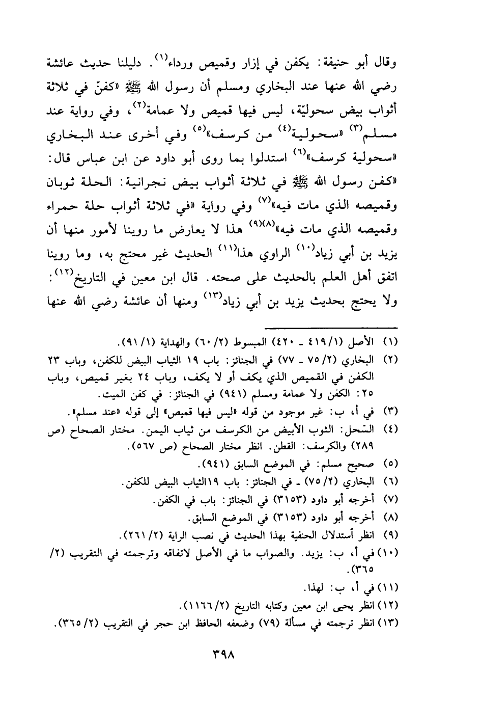 وَقَالَ أَبُو حنيفَة: يُكفن فِي إِزَار وقميص ورداء. دليلنا حَدِيث عَائِشَة رَضِي الله عَنْهَا عِنْد البُخَارِيّ وَمُسلم أَن رَسُول الله - صَلَّى اللَّهُ عَلَيْهِ وَسَلَّم َ - " كفن فِي ثَلَاثَة أَثوَاب بيض سحُولِيَّة، لَيْسَ فِيهَا قَمِيص وَلَا عِمَامَة، وَفِي رِوَايَة عِنْد مُسلم " سحُولِيَّة من كُرْسُف " وَفِي أُخْرَى عِنْد البُخَارِيّ " سحُولِيَّة كُرْسُف " استدلوا بِمَا روى أَبُو دَاوُد عَن ابْن عَبَّاس قَالَ: " كفن رَسُول الله - صَلَّى اللَّهُ عَلَيْهِ وَسَلَّم َ - فِي ثَلَاثَة أَثوَاب بيض نجرانية: الْحلَّة ثَوْبَان وقميصه الَّذِي مَاتَ فِيهِ " وَفِي رِوَايَة " فِي ثَلَاثَة أَثوَاب حلَّة حَمْرَاء وقميصه الَّذِي مَاتَ فِيهِ " هَذَا لَا يُعَارض مَا روينَا لأمور مِنْهَا أَن يزِيد بن أبي زِيَاد الرَّاوِي هَذَا الحَدِيث غير مُحْتَج بِهِ، وَمَا روينَا اتّفق أهل الْعلم بِالْحَدِيثِ على صِحَّته. قَالَ ابْن معِين فِي التَّارِيخ: وَلَا يحْتَج بِحَدِيث يزِيد بن أبي زِيَاد وَمِنْهَا أَن عَائِشَة رَضِي الله عَنْهَا