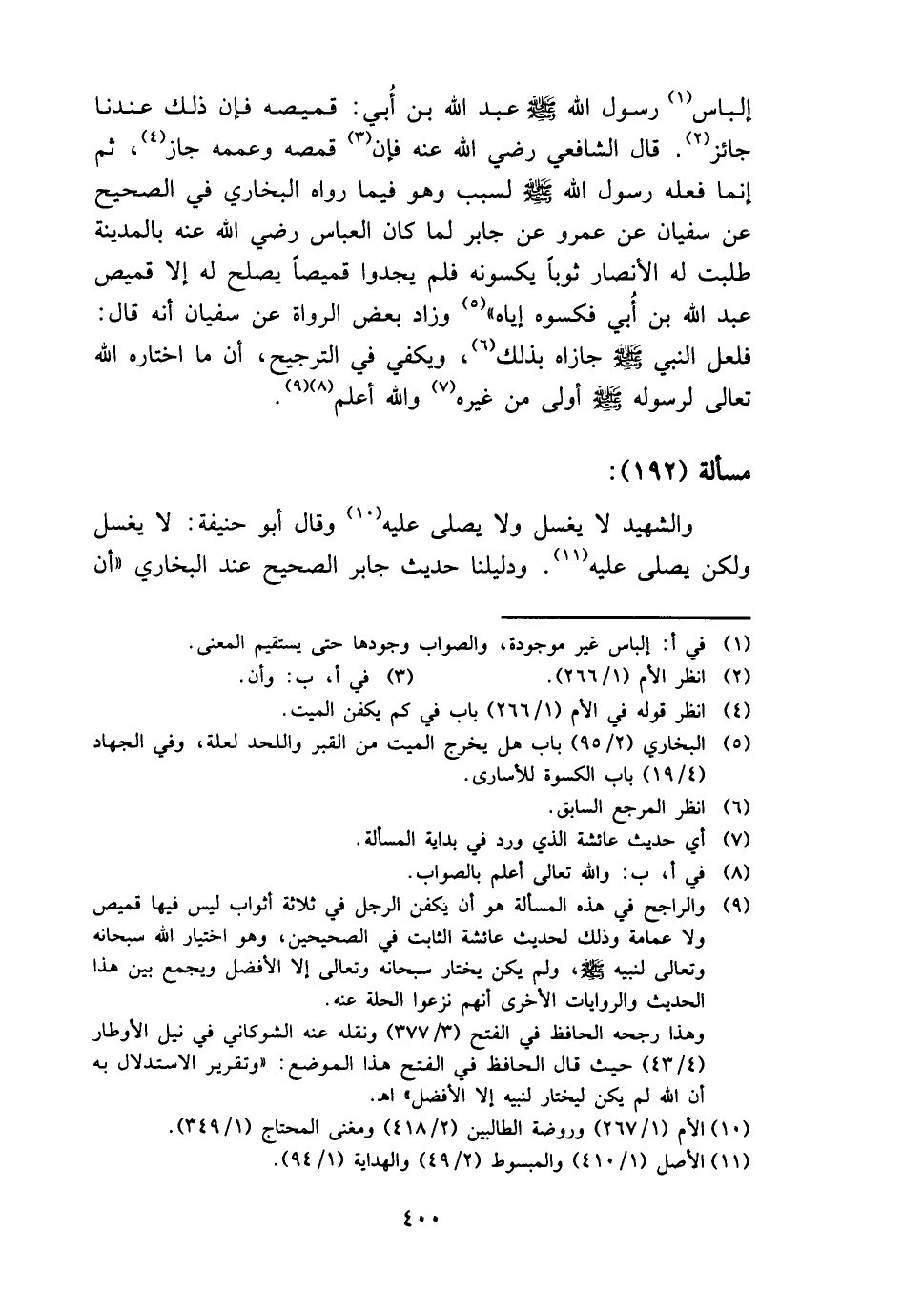 إلباس رَسُول الله - صَلَّى اللَّهُ عَلَيْهِ وَسَلَّم َ - عبد الله بن أُبي: قَمِيصه فَإِن ذَلِك عندنَا جَائِز. قَالَ الشَّافِعِي رَضِي الله عَنهُ فَإِن قمصه وعممه جَازَ، ثمَّ إِنَّمَا فعله رَسُول الله - صَلَّى اللَّهُ عَلَيْهِ وَسَلَّم َ - لسَبَب وَهُوَ فِيمَا رَوَاهُ البُخَارِيّ فِي الصَّحِيح عَن سُفْيَان عَن عَمْرو عَن جَابر لما كَانَ الْعَبَّاس رَضِي الله عَنهُ بِالْمَدِينَةِ طلبت لَهُ الْأَنْصَار ثوبا يكسونه فَلم يَجدوا قَمِيصًا يصلح لَهُ إِلَّا قَمِيص عبد الله بن أُبي فكسوه إِيَّاه " وَزَاد بعض الروَاة عَن سُفْيَان أَنه قَالَ: فَلَعَلَّ النَّبِي - صَلَّى اللَّهُ عَلَيْهِ وَسَلَّم َ - جازاه بذلك، وَيَكْفِي فِي التَّرْجِيح، أَن مَا اخْتَارَهُ الله تَعَالَى لرَسُوله - صَلَّى اللَّهُ عَلَيْهِ وَسَلَّم َ - أولى من غَيره وَالله أعلم.