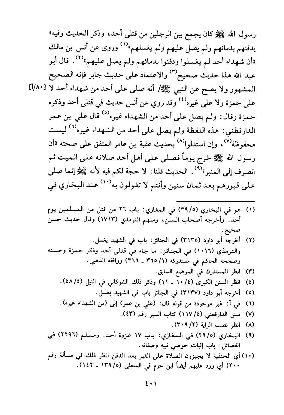 رَسُول الله - صَلَّى اللَّهُ عَلَيْهِ وَسَلَّم َ - كَانَ يجمع بَين الرجلَيْن من قَتْلَى أحد، وَذكر الحَدِيث وَفِيه " يدفنهم بدمائهم وَلم يصل عَلَيْهِم وَلم يغسلهم " وروى عَن أنس بن مَالك " أَن شُهَدَاء أحد لم يغسلوا ودفنوا بدمائهم وَلم يصل عَلَيْهِم ". قَالَ أَبُو عبد الله هَذَا حَدِيث صَحِيح والاعتماد على حَدِيث جَابر فَإِنَّهُ الصَّحِيح الْمَشْهُور وَلَا يَصح عَن النَّبِي - صَلَّى اللَّهُ عَلَيْهِ وَسَلَّم َ - / أَنه صلى على أحد من شُهَدَاء أحد لَا على حَمْزَة وَلَا على غَيره وَقد رُوِيَ عَن أنس حَدِيث فِي قَتْلَى أحد وَذكره حَمْزَة وَقَالَ: وَلم يصل على أحد من الشُّهَدَاء غَيره قَالَ عَليّ بن عمر الدَّارَقُطْنِيّ: هَذِه اللَّفْظَة وَلم يصل على أحد من الشُّهَدَاء غَيره لَيست مَحْفُوظَة، وَإِن استدلوا بِحَدِيث عقبَة بن عَامر الْمُتَّفق على صِحَّته " أَن رَسُول الله - صَلَّى اللَّهُ عَلَيْهِ وَسَلَّم َ - خرج يَوْمًا فصلى على أهل أحد صلَاته على الْمَيِّت ثمَّ انْصَرف إِلَى الْمِنْبَر ". الحَدِيث قُلْنَا: لَا حجَّة لكم فِيهِ لِأَنَّهُ - صَلَّى اللَّهُ عَلَيْهِ وَسَلَّم َ - إِنَّمَا صلى على قُبُورهم بعد ثَمَان سِنِين وَأَنْتُم لَا تَقولُونَ بِهِ عِنْد البُخَارِيّ فِي