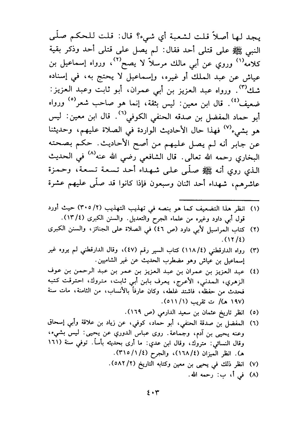 يجد لَهَا أصلا قلت لشعبة أَي شَيْء؟ قَالَ: قلت للْحكم صلى النَّبِي - صَلَّى اللَّهُ عَلَيْهِ وَسَلَّم َ - على قَتْلَى أحد فَقَالَ: لم يصل على قَتْلَى أحد وَذكر بَقِيَّة كَلَامه وَرُوِيَ عَن أبي مَالك مُرْسلا لَا يَصح، وَرَوَاهُ إِسْمَاعِيل بن عَيَّاش عَن عبد الْملك أَو غَيره، وَإِسْمَاعِيل لَا يحْتَج بِهِ، فِي إِسْنَاده شكّ. وَرَوَاهُ عبد الْعَزِيز بن أبي عمرَان، أَبُو ثَابت وَعبد الْعَزِيز: ضَعِيف. قَالَ ابْن معِين: لَيْسَ بِثِقَة، إِنَّمَا هُوَ صَاحب شعر وَرَوَاهُ أَبُو حَمَّاد الْمفضل بن صَدَقَة الْحَنَفِيّ الْكُوفِي. قَالَ ابْن معِين: لَيْسَ هُوَ بِشَيْء فَهَذَا حَال الْأَحَادِيث الْوَارِدَة فِي الصَّلَاة عَلَيْهِم، وحديثنا عَن جَابر أَنه لم يصل عَلَيْهِم من أصح الْأَحَادِيث. حكم بِصِحَّتِهِ البُخَارِيّ رَحمَه الله تَعَالَى. قَالَ الشَّافِعِي رَضِي الله عَنهُ فِي الحَدِيث الَّذِي رُوِيَ أَنه - صَلَّى اللَّهُ عَلَيْهِ وَسَلَّم َ - صلى على شُهَدَاء أحد تِسْعَة تِسْعَة، وَحَمْزَة عاشرهم، شُهَدَاء أحد اثْنَان وَسَبْعُونَ فَإِذا كَانُوا قد صلى عَلَيْهِم عشرَة