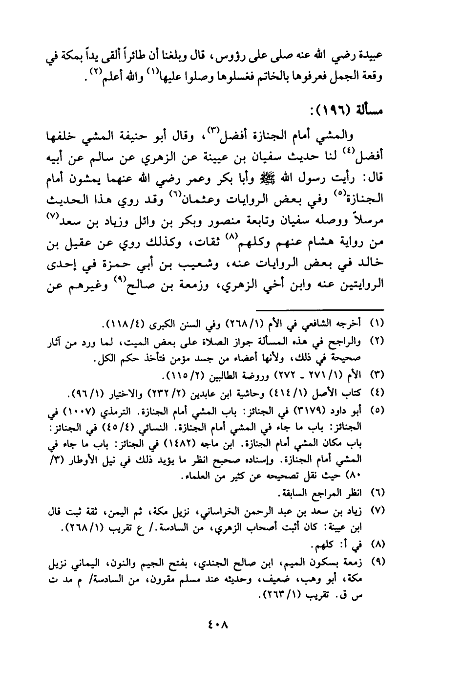 وَالْمَشْي أَمَام الْجِنَازَة أفضل، وَقَالَ أَبُو حنيفَة الْمَشْي خلفهَا أفضل لنا حَدِيث سُفْيَان بن عُيَيْنَة عَن الزُّهْرِيّ عَن سَالم عَن أَبِيه قَالَ: رَأَيْت رَسُول الله - صَلَّى اللَّهُ عَلَيْهِ وَسَلَّم َ - وَأَبا بكر وَعمر رَضِي الله عَنْهُمَا يَمْشُونَ أَمَام الْجِنَازَة وَفِي بعض الرِّوَايَات وَعُثْمَان وَقد رُوِيَ هَذَا الحَدِيث مُرْسلا وَوَصله سُفْيَان وَتَابعه مَنْصُور وَبكر بن وَائِل وَزِيَاد بن سعد من رِوَايَة هِشَام عَنْهُم وَكلهمْ ثِقَات، وَكَذَلِكَ رُوِيَ عَن عقيل بن خَالِد فِي بعض الرِّوَايَات عَنهُ، وَشُعَيْب بن أبي حَمْزَة فِي إِحْدَى الرِّوَايَتَيْنِ عَنهُ وَابْن أخي الزُّهْرِيّ، وَزَمعَة بن صَالح وَغَيرهم عَن