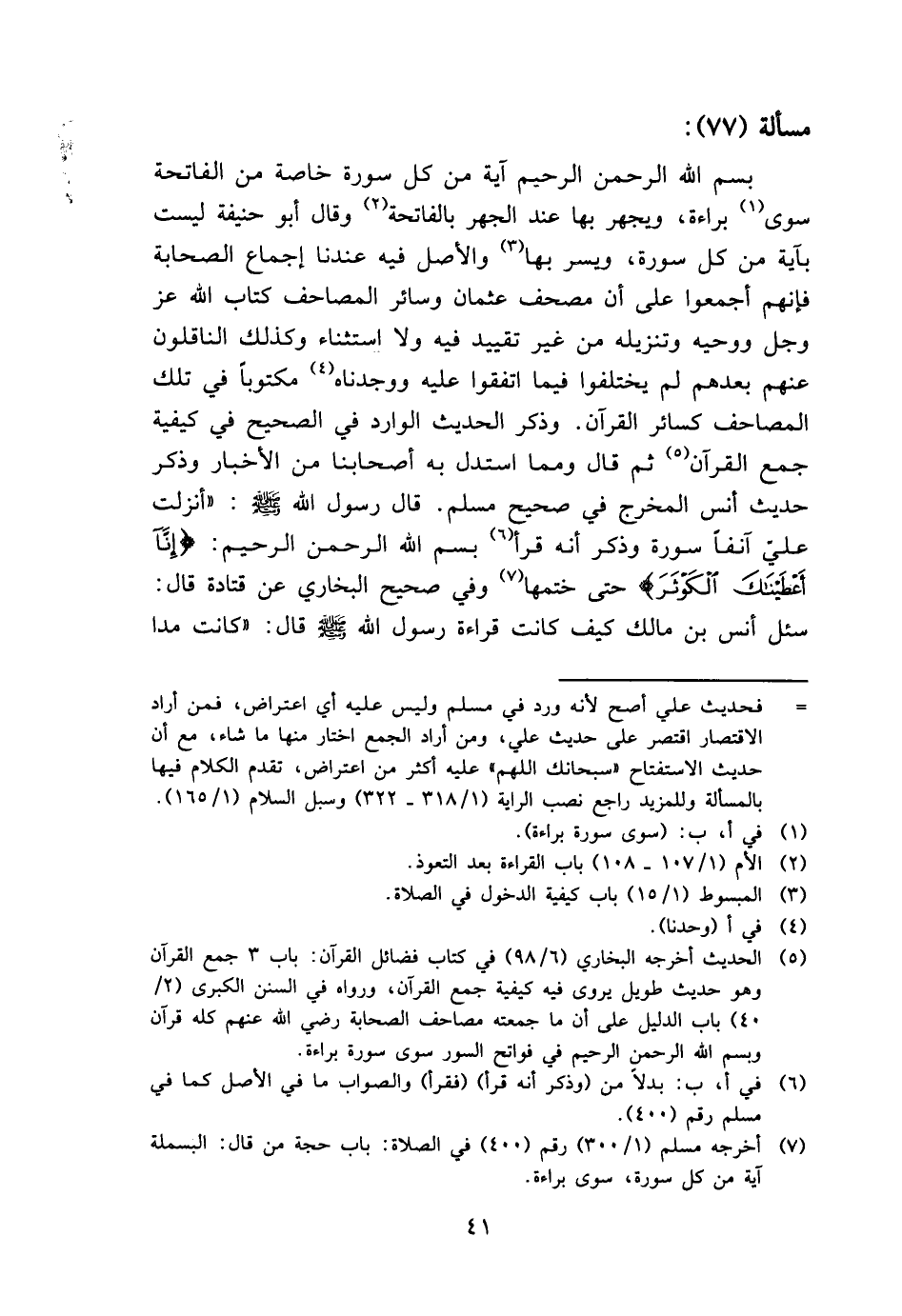 بِسم الله الرَّحْمَن الرَّحِيم آيَة من كل سُورَة خَاصَّة من الْفَاتِحَة سُورَة بَرَاءَة، ويجهر بهَا عِنْد الْجَهْر بِالْفَاتِحَةِ وَقَالَ أَبُو حنيفَة لَيست بِآيَة من كل سُورَة، وَيسر بهَا وَالْأَصْل فِيهِ عندنَا إِجْمَاع الصَّحَابَة فَإِنَّهُم أَجمعُوا على أَن مصحف عُثْمَان وَسَائِر الْمَصَاحِف كتاب الله عز وَجل ووحيه وتنزيله من غير تَقْيِيد فِيهِ وَلَا اسْتثِْنَاء وَكَذَلِكَ الناقلون عَنْهُم بعدهمْ لم يَخْتَلِفُوا فِيمَا اتَّفقُوا عَلَيْهِ ووجدناه مَكْتُوبًا فِي تِلْكَ الْمَصَاحِف كَسَائِر الْقُرْآن. وَذكر الحَدِيث الْوَارِد فِي الصَّحِيح فِي كَيْفيَّة جمع الْقُرْآن ثمَّ قَالَ وَمِمَّا اسْتدلَّ بِهِ أَصْحَابنَا من الْأَخْبَار وَذكر حَدِيث أنس الْمخْرج فِي صَحِيح مُسلم. قَالَ رَسُول الله - صَلَّى اللَّهُ عَلَيْهِ وَسَلَّم َ -: " أنزلت عليّ آنِفا سُورَة وَذكر أَنه قَرَأَ بِسم الله الرَّحْمَن الرَّحِيم: {إِنَّا أعطيناك الْكَوْثَر} حَتَّى خَتمهَا وَفِي صَحِيح البُخَارِيّ عَن قَتَادَة قَالَ: سُئِلَ أنس بن مَالك كَيفَ كَانَت قِرَاءَة رَسُول الله - صَلَّى اللَّهُ عَلَيْهِ وَسَلَّم َ - قَالَ: " كَانَت مدا