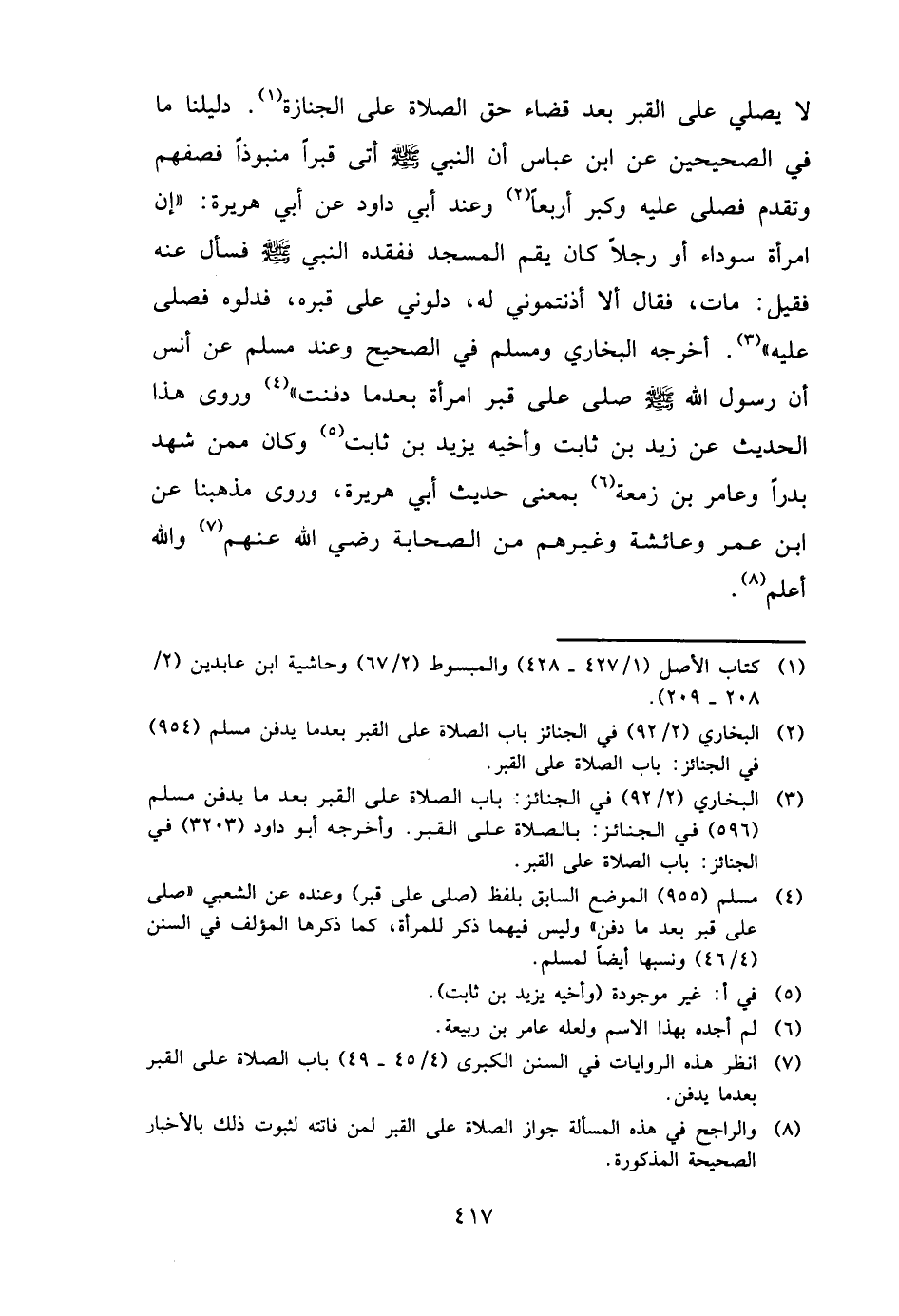 لَا يُصَلِّي على الْقَبْر بعد قَضَاء حق الصَّلَاة على الْجِنَازَة. دليلنا مَا فِي الصَّحِيحَيْنِ عَن ابْن عَبَّاس أَن النَّبِي - صَلَّى اللَّهُ عَلَيْهِ وَسَلَّم َ - أَتَى قبرا مَنْبُوذًا فصفهم وَتقدم فصلى عَلَيْهِ وَكبر أَرْبعا وَعند أبي دَاوُد عَن أبي هُرَيْرَة: " إِن امْرَأَة سَوْدَاء أَو رجلا كَانَ يقم الْمَسْجِد فَفَقدهُ النَّبِي - صَلَّى اللَّهُ عَلَيْهِ وَسَلَّم َ - فَسَأَلَ عَنهُ فَقيل: مَاتَ، فَقَالَ أَلا أذنتموني لَهُ، دلوني على قَبره، فدلوه فصلى عَلَيْهِ ". أخرجه البُخَارِيّ وَمُسلم فِي الصَّحِيح وَعند مُسلم عَن أنس أَن رَسُول الله - صَلَّى اللَّهُ عَلَيْهِ وَسَلَّم َ - صلى على قبر امْرَأَة بَعْدَمَا دفنت " وروى هَذَا الحَدِيث عَن زيد بن ثَابت وأخيه يزِيد بن ثَابت وَكَانَ مِمَّن شهد بَدْرًا وعامر بن زَمعَة بِمَعْنى حَدِيث أبي هُرَيْرَة، وروى مَذْهَبنَا عَن ابْن عمر وَعَائِشَة وَغَيرهم من الصَّحَابَة رَضِي الله عَنْهُم وَالله أعلم.
