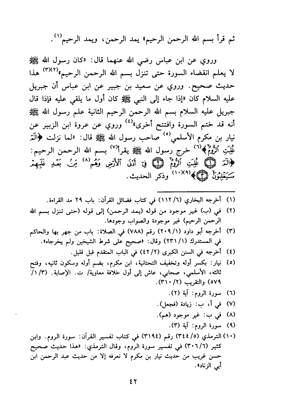 وَرُوِيَ عَن ابْن عَبَّاس رَضِي الله عَنْهُمَا قَالَ: " كَانَ رَسُول الله - صَلَّى اللَّهُ عَلَيْهِ وَسَلَّم َ - لَا يعلم انْقِضَاء السُّورَة حَتَّى تنزل بِسم الله الرَّحْمَن الرَّحِيم " هَذَا حَدِيث صَحِيح. وَرُوِيَ عَن سعيد بن جُبَير عَن ابْن عَبَّاس أَن جِبْرِيل عَلَيْهِ السَّلَام كَانَ " إِذا جَاءَ إِلَى النَّبِي - صَلَّى اللَّهُ عَلَيْهِ وَسَلَّم َ - كَانَ أول مَا يلقِي عَلَيْهِ فَإِذا قَالَ جِبْرِيل عَلَيْهِ السَّلَام بِسم الله الرَّحْمَن الرَّحِيم الثَّانِيَة علم رَسُول الله - صَلَّى اللَّهُ عَلَيْهِ وَسَلَّم َ - أَنه قد ختم السُّورَة وافتتح أُخْرَى " وَرُوِيَ عَن عُرْوَة ابْن الزبير عَن نيار بن مكرم الْأَسْلَمِيّ صَاحب رَسُول الله - صَلَّى اللَّهُ عَلَيْهِ وَسَلَّم َ - قَالَ: " لما نزلت {الم غلبت الرّوم} خرج رَسُول الله - صَلَّى اللَّهُ عَلَيْهِ وَسَلَّم َ - يقْرَأ بِسم الله الرَّحْمَن الرَّحِيم: {الم (1) غلبت الرّوم (2) فِي أدنى الأَرْض وهم من بعد غلبهم سيغلبون (3) } وَذكر الحَدِيث.