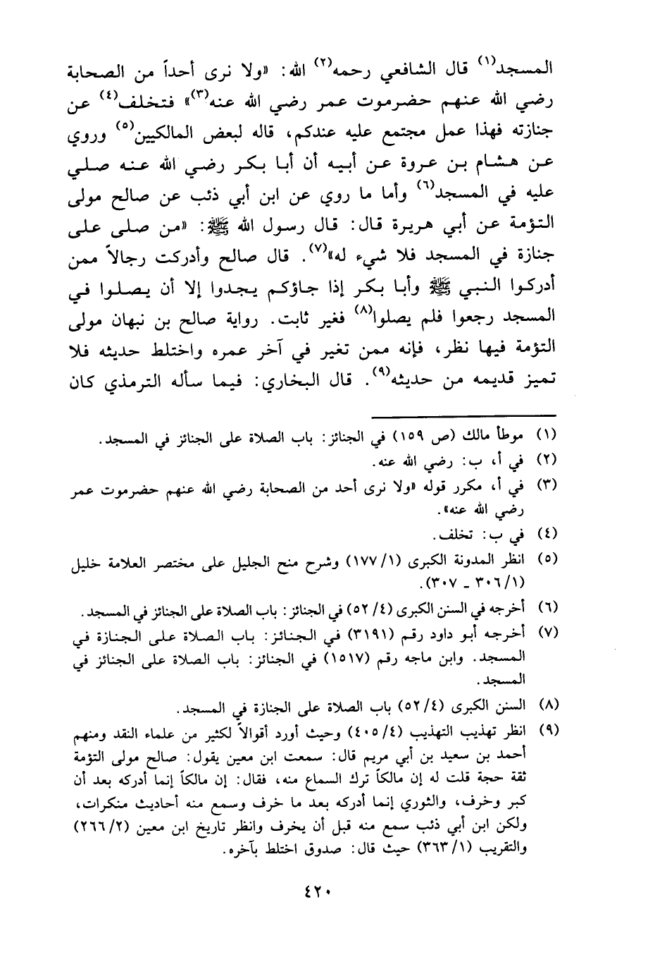 الْمَسْجِد قَالَ الشَّافِعِي رَحمَه الله: " وَلَا نرى أحدا من الصَّحَابَة رَضِي الله عَنْهُم حَضرمَوْت عمر رَضِي الله عَنهُ " فَتخلف عَن جنَازَته فَهَذَا عمل مُجْتَمع عَلَيْهِ عنْدكُمْ، قَالَه لبَعض المالكيين وَرُوِيَ عَن هِشَام بن عُرْوَة عَن أَبِيه أَن أَبَا بكر رَضِي الله عَنهُ صلي عَلَيْهِ فِي الْمَسْجِد وَأما مَا رُوِيَ عَن ابْن أبي ذِئْب عَن صَالح مولى التؤمة عَن أبي هُرَيْرَة قَالَ: قَالَ رَسُول الله - صَلَّى اللَّهُ عَلَيْهِ وَسَلَّم َ -: " من صلى على جَنَازَة فِي الْمَسْجِد فَلَا شَيْء لَهُ ". قَالَ صَالح وَأدْركت رجَالًا مِمَّن أدركوا النَّبِي - صَلَّى اللَّهُ عَلَيْهِ وَسَلَّم َ - وَأَبا بكر إِذا جاؤكم يَجدوا إِلَّا أَن يصلوا فِي الْمَسْجِد رجعُوا فَلم يصلوا فَغير ثَابت. رِوَايَة صَالح بن نَبهَان مولى التؤمة فِيهَا نظر، فَإِنَّهُ مِمَّن تغير فِي آخر عمره وَاخْتَلَطَ حَدِيثه فَلَا تميز قديمه من حَدِيثه. قَالَ البُخَارِيّ: فِيمَا سَأَلَهُ التِّرْمِذِيّ كَانَ