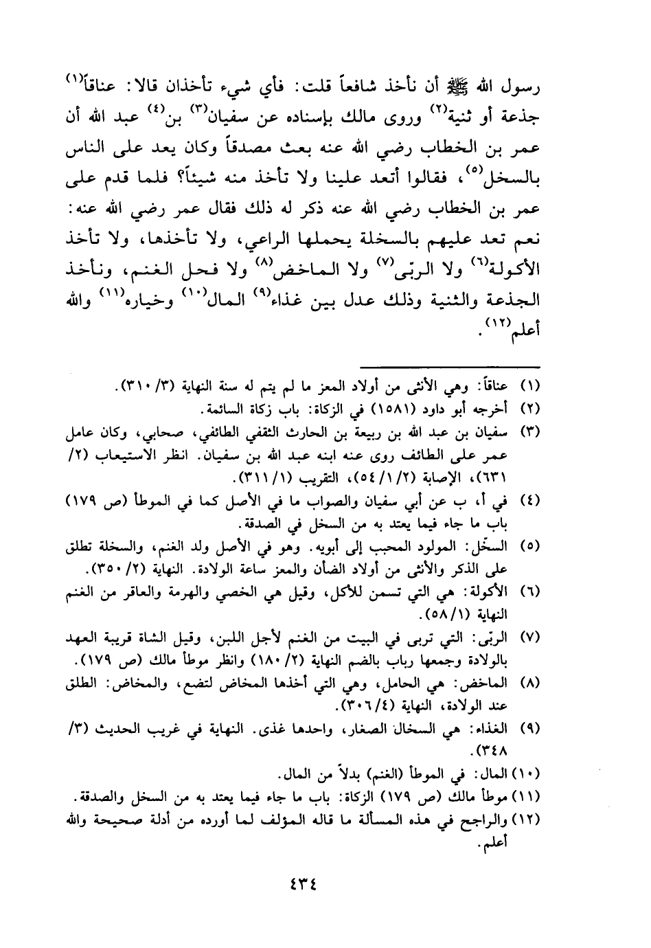 رَسُول الله - صَلَّى اللَّهُ عَلَيْهِ وَسَلَّم َ - أَن نَأْخُذ شافعا قلت: فَأَي شَيْء تأخذان قَالَا: عنَاقًا جَذَعَة أَو ثنية وروى مَالك بِإِسْنَادِهِ عَن سُفْيَان بن عبد الله أَن عمر بن الْخطاب رَضِي الله عَنهُ بعث مُصدقا وَكَانَ يعد على النَّاس بالسخل، فَقَالُوا أتعد علينا وَلَا تَأْخُذ مِنْهُ شَيْئا؟ فَلَمَّا قدم على عمر بن الْخطاب رَضِي الله عَنهُ ذكر لَهُ ذَلِك فَقَالَ عمر رَضِي الله عَنهُ: نعم تعد عَلَيْهِم بالسخله يحملهَا الرَّاعِي، وَلَا تأخذها، وَلَا تَأْخُذ الأكولة وَلَا الربى وَلَا الماخض وَلَا فَحل الْغنم، ونأخذ الْجَذعَة والثنية وَذَلِكَ عدل بَين غذَاء المَال وخياره وَالله أعلم.