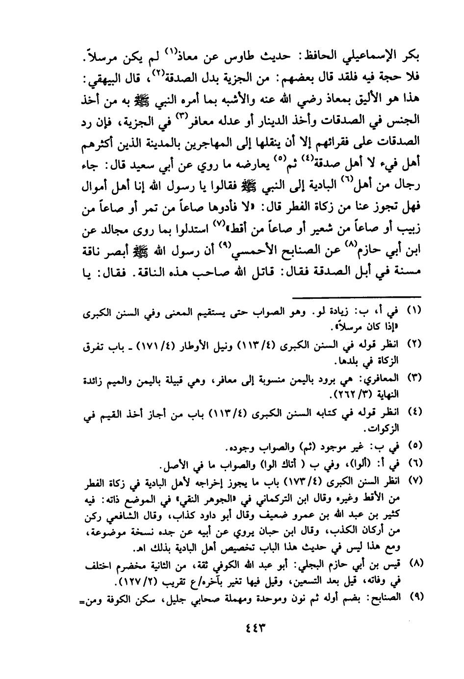 بكر الْإِسْمَاعِيلِيّ الْحَافِظ: حَدِيث طَاوس عَن معَاذ لم يكن مُرْسلا. فَلَا حجَّة فِيهِ فَلَقَد قَالَ بَعضهم: من الْجِزْيَة بدل الصَّدَقَة، قَالَ الْبَيْهَقِيّ هَذَا هُوَ الْأَلْيَق بمعاذ رَضِي الله عَنهُ وَالْأَشْبَه بِمَا أمره النَّبِي - صَلَّى اللَّهُ عَلَيْهِ وَسَلَّم َ - بِهِ من أَخذ الْجِنْس فِي الصَّدقَات وَأخذ الدِّينَار أَو عدله معافر فِي الْجِزْيَة، فَإِن رد الصَّدقَات على فقرائهم إِلَّا أَن ينقلها إِلَى الْمُهَاجِرين بِالْمَدِينَةِ الَّذين أَكْثَرهم أهل فَيْء لَا أهل صَدَقَة ثمَّ يُعَارضهُ مَا رُوِيَ عَن أبي سعيد قَالَ: جَاءَ رجال من أهل الْبَادِيَة إِلَى النَّبِي - صَلَّى اللَّهُ عَلَيْهِ وَسَلَّم َ - فَقَالُوا يَا رَسُول الله إِنَّا أهل أَمْوَال فَهَل تجوز عَنَّا من زَكَاة الْفطر قَالَ: " لَا فأدوها صَاعا من تمر أَو صَاعا من زبيب أَو صَاعا من شعير أَو صَاعا من أقط " استدلوا بِمَا روى مجَالد عَن ابْن أبي حَازِم عَن الصنابح الأحمسي أَن رَسُول الله - صَلَّى اللَّهُ عَلَيْهِ وَسَلَّم َ - أبْصر نَاقَة مُسِنَّة فِي أبل الصَّدَقَة فَقَالَ: قَاتل الله صَاحب هَذِه النَّاقة فَقَالَ: يَا