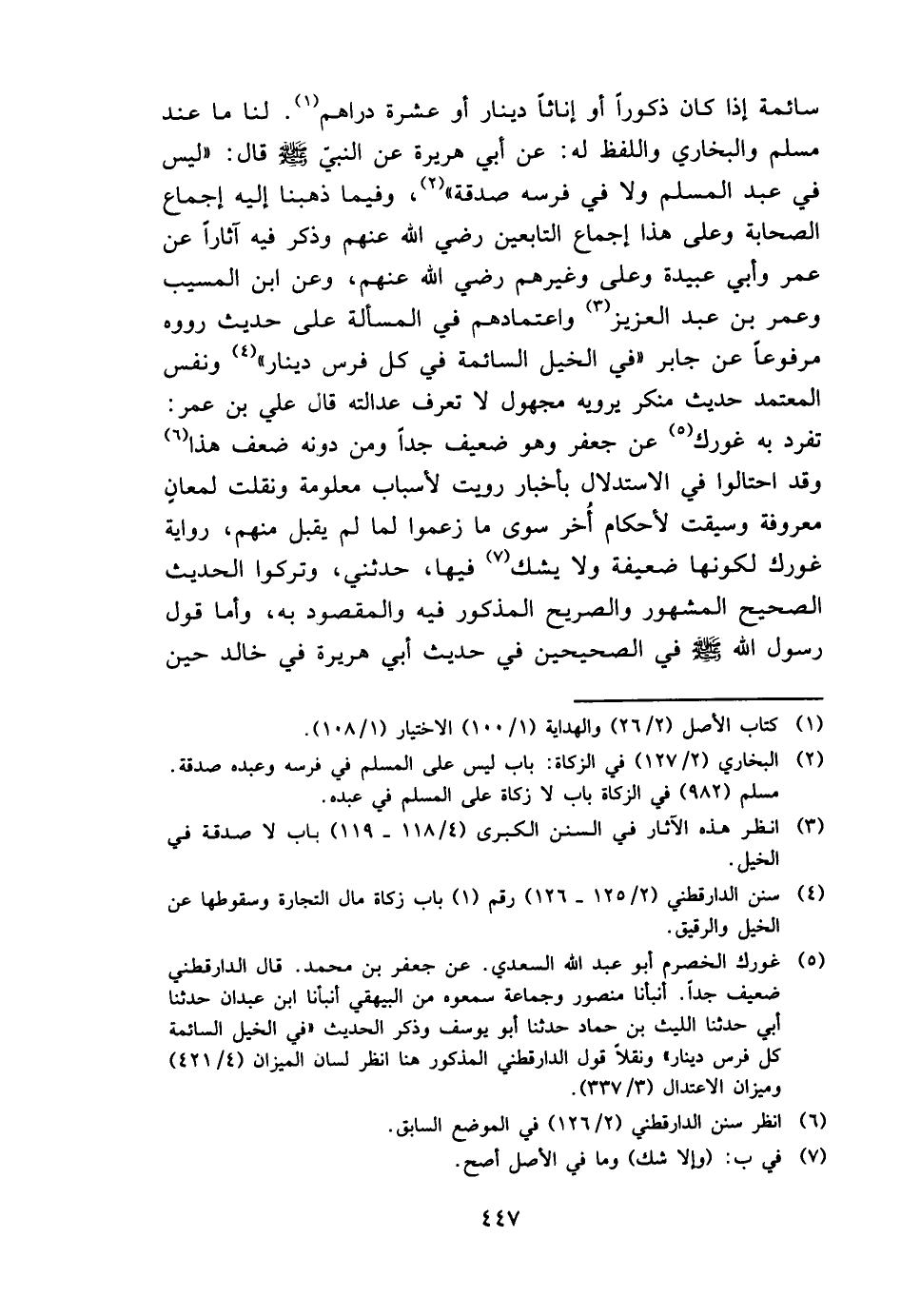 سَائِمَة إِذا كَانَ ذُكُورا أَو إِنَاثًا دِينَار أَو عشرَة دَرَاهِم. لنا مَا عِنْد مُسلم وَالْبُخَارِيّ وَاللَّفْظ لَهُ: عَن أبي هُرَيْرَة عَن النَّبِي - صَلَّى اللَّهُ عَلَيْهِ وَسَلَّم َ - قَالَ: " لَيْسَ فِي عبد الْمُسلم وَلَا فِي فرسه صَدَقَة "، وَفِيمَا ذَهَبْنَا إِلَيْهِ إِجْمَاع الصَّحَابَة وعَلى هَذَا إِجْمَاع التَّابِعين رَضِي الله عَنْهُم وَذكر فِيهِ آثارا عَن عمر وَأبي عُبَيْدَة وَعلي وَغَيرهم رَضِي الله عَنْهُم، وَعَن ابْن الْمسيب وَعمر بن عبد الْعَزِيز واعتمادهم فِي الْمَسْأَلَة على حَدِيث رَوَوْهُ مَرْفُوعا عَن جَابر " فِي الْخَيل السَّائِمَة فِي كل فرس دِينَار " وَنَفس الْمُعْتَمد حَدِيث مُنكر يرويهِ مَجْهُول لَا تعرف عَدَالَته قَالَ عَليّ بن عمر: تفرد بِهِ غورك عَن جَعْفَر وَهُوَ ضَعِيف جدا وَمن دونه ضعف هَذَا وَقد احْتَالُوا فِي الِاسْتِدْلَال بأخبار رويت لأسباب مَعْلُومَة ونقلت لمعان مَعْرُوفَة وسيقت لأحكام أخر سوى مَا زَعَمُوا لما لم يقبل مِنْهُم، رِوَايَة غورك لكَونهَا ضَعِيفَة وَلَا يشك فِيهَا، حَدثنِي، وَتركُوا الحَدِيث الصَّحِيح الْمَشْهُور والصريح الْمَذْكُور فِيهِ وَالْمَقْصُود بِهِ، وَأما قَول رَسُول الله - صَلَّى اللَّهُ عَلَيْهِ وَسَلَّم َ - فِي الصَّحِيحَيْنِ فِي حَدِيث أبي هُرَيْرَة فِي خَالِد حِين