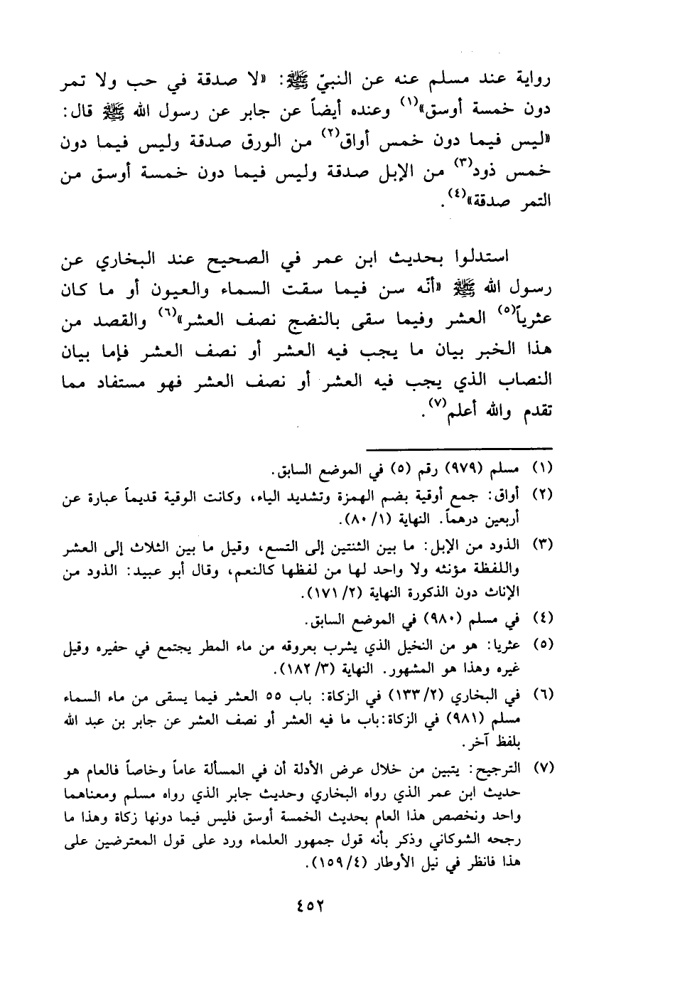 استدلوا بِحَدِيث ابْن عمر فِي الصَّحِيح عِنْد البُخَارِيّ عَن رَسُول الله - صَلَّى اللَّهُ عَلَيْهِ وَسَلَّم َ - " أَنه سنّ فِيمَا سقت السَّمَاء والعيون أَو مَا كَانَ عثريا الْعشْر وَفِيمَا سقى بالنضج نصف الْعشْر " وَالْقَصْد من هَذَا الْخَبَر بَيَان مَا يجب فِيهِ الْعشْر أَو نصف الْعشْر فإمَّا بَيَان النّصاب الَّذِي يجب فِيهِ الْعشْر أَو نصف الْعشْر فَهُوَ مُسْتَفَاد مِمَّا تقدم وَالله أعلم.
