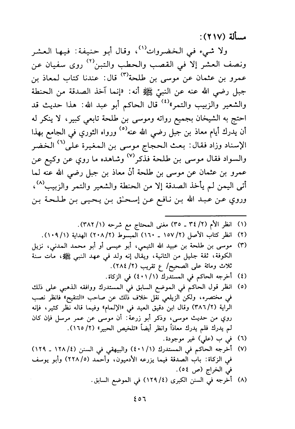 وَلَا شَيْء فِي الخضروات، وَقَالَ أَبُو حنيفَة: فِيهَا الْعشْر وَنصف الْعشْر إِلَّا فِي الْقصب والحطب والتبن روى سُفْيَان عَن عَمْرو بن عُثْمَان عَن مُوسَى بن طَلْحَة قَالَ: عندنَا كتاب لِمعَاذ بن جبل رَضِي الله عَنهُ عَن النَّبِي - صَلَّى اللَّهُ عَلَيْهِ وَسَلَّم َ - أَنه: " إِنَّمَا آخذ الصَّدَقَة من الْحِنْطَة وَالشعِير وَالزَّبِيب وَالتَّمْر " قَالَ الْحَاكِم أَبُو عبد الله: هَذَا حَدِيث قد احْتج بِهِ الشَّيْخَانِ بِجَمِيعِ رُوَاته ومُوسَى بن طَلْحَة تَابِعِيّ كَبِير، لَا يُنكر لَهُ أَن يدْرك أَيَّام معَاذ بن جبل رَضِي الله عَنهُ وَرَوَاهُ الثَّوْريّ فِي الْجَامِع بِهَذَا الْإِسْنَاد وَزَاد فَقَالَ: بعث الْحجَّاج مُوسَى بن الْمُغيرَة على الْخضر والسواد فَقَالَ مُوسَى بن طَلْحَة فَذكر وَشَاهده مَا رُوِيَ عَن وَكِيع عَن عَمْرو بن عُثْمَان عَن مُوسَى بن طَلْحَة أَن معَاذ بن جبل رَضِي الله عَنهُ لما أَتَى الْيمن لم يَأْخُذ الصَّدَقَة إِلَّا من الْحِنْطَة وَالشعِير وَالتَّمْر وَالزَّبِيب، وَرُوِيَ عَن عبد الله بن نَافِع عَن إِسْحَق بن يحيى بن طَلْحَة بن