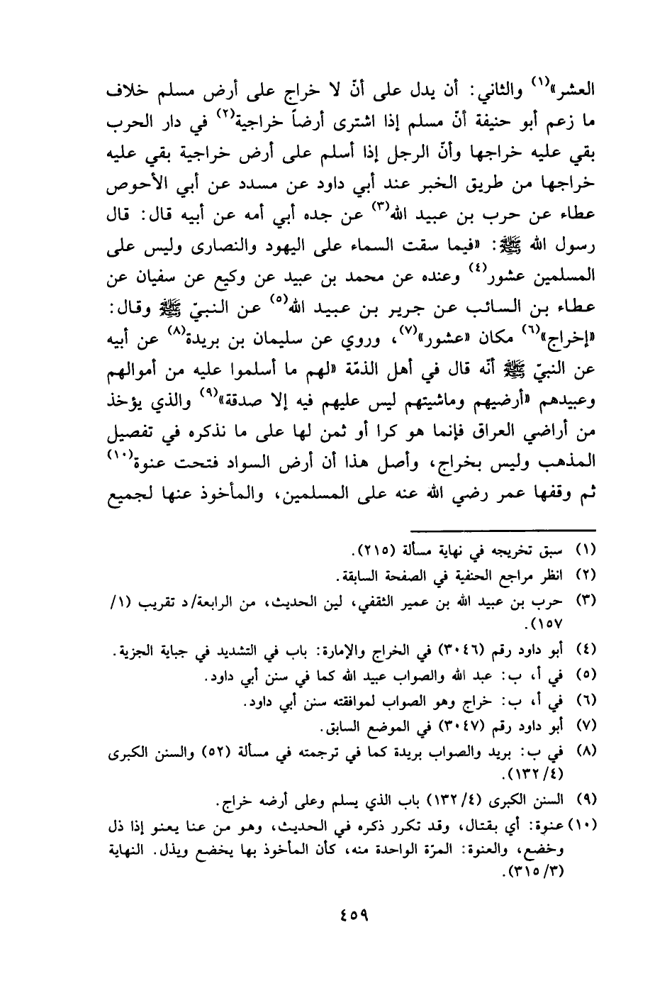الْعشْر " وَالثَّانِي: أَن يدل على أَن لَا خراج على أَرض مُسلم خلاف مَا زعم أَبُو حنيفَة أَن مُسلم إِذا اشْترى أَرضًا خَرَاجِيَّة فِي دَار الْحَرْب بَقِي عَلَيْهَا خراجها وَأَن الرجل إِذا أسلم على أَرض خَرَاجِيَّة بَقِي عَلَيْهِ خراجها من طَرِيق الْخَبَر عِنْد أبي دَاوُد عَن مُسَدّد عَن أبي الْأَحْوَص عَطاء عَن حَرْب بن عبيد الله عَن جده أبي أمه عَن أَبِيه قَالَ: قَالَ رَسُول الله - صَلَّى اللَّهُ عَلَيْهِ وَسَلَّم َ -: " فِيمَا سقت السَّمَاء على الْيَهُود وَالنَّصَارَى وَلَيْسَ على الْمُسلمين عشور وَعِنْده عَن مُحَمَّد بن عبيد عَن وَكِيع عَن سُفْيَان عَن عَطاء بن السَّائِب عَن جرير بن عبيد الله عَن النَّبِي - صَلَّى اللَّهُ عَلَيْهِ وَسَلَّم َ - وَقَالَ: " إِخْرَاج " مَكَان " عشور "، وَرُوِيَ عَن سُلَيْمَان بن بُرَيْدَة عَن أَبِيه عَن النَّبِي - صَلَّى اللَّهُ عَلَيْهِ وَسَلَّم َ - أَنه قَالَ فِي أهل الذِّمَّة " لَهُم مَا أَسْلمُوا عَلَيْهِ من أَمْوَالهم وعبيدهم " أرضيهم وماشيتهم لَيْسَ عَلَيْهِم فِيهِ إِلَّا صَدَقَة " وَالَّذِي يُؤْخَذ من أَرَاضِي الْعرَاق فَإِنَّمَا هُوَ كرا أَو ثمن لَهَا على مَا نذكرهُ فِي تَفْصِيل الْمَذْهَب وَلَيْسَ بخراج، وأصل هَذَا أَن أَرض السوَاد فتحت عنْوَة ثمَّ وَقفهَا عمر رَضِي الله عَنهُ على الْمُسلمين، والمأخوذ عَنْهَا لجَمِيع