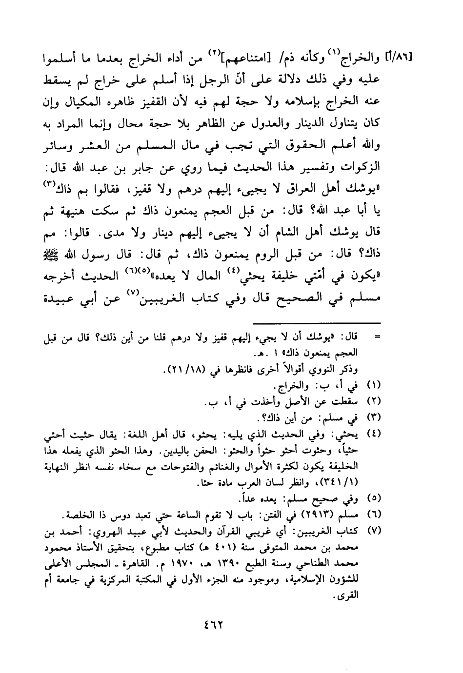 وَالْخَرَاج وَكَأَنَّهُ ذمّ / [امتناعهم] من أَدَاء الْخراج بَعْدَمَا مَا أَسْلمُوا عَلَيْهِ وَفِي ذَلِك دلَالَة على أَن الرجل إِذا أسلم على خراج لم يسْقط عَنهُ الْخراج بِإِسْلَامِهِ وَلَا حجَّة لَهُم فِيهِ لِأَن القفيز ظَاهره الْمِكْيَال وَإِن كَانَ يتَنَاوَل الدِّينَار والعدول عَن الظَّاهِر بِلَا حجَّة محَال وَإِنَّمَا المُرَاد بِهِ وَالله أعلم الْحُقُوق الَّتِي تجب فِي مَال الْمُسلم من الْعشْر وَسَائِر الزكوات وَتَفْسِير هَذَا الحَدِيث فِيمَا رُوِيَ عَن جَابر بن عبد الله قَالَ: " يُوشك أهل الْعرَاق لَا يَجِيء إِلَيْهِم دِرْهَم وَلَا قفيز، فَقَالُوا بِمَ ذَاك يَا أَبَا عبد الله؟ قَالَ: من قبل الْعَجم يمْنَعُونَ ذَاك ثمَّ سكت هنيهة ثمَّ قَالَ يُوشك أهل الشَّام أَن لَا يَجِيء إِلَيْهِم دِينَار وَلَا مدى. قَالُوا: مِم ذَاك؟ قَالَ: من قبل الرّوم يمْنَعُونَ ذَاك، ثمَّ قَالَ: قَالَ رَسُول الله - صَلَّى اللَّهُ عَلَيْهِ وَسَلَّم َ - " يكون فِي أمتِي خَليفَة يحثي المَال لَا يعده " الحَدِيث أخرجه مُسلم فِي الصَّحِيح قَالَ وَفِي كتاب الغريبين عَن أبي عُبَيْدَة