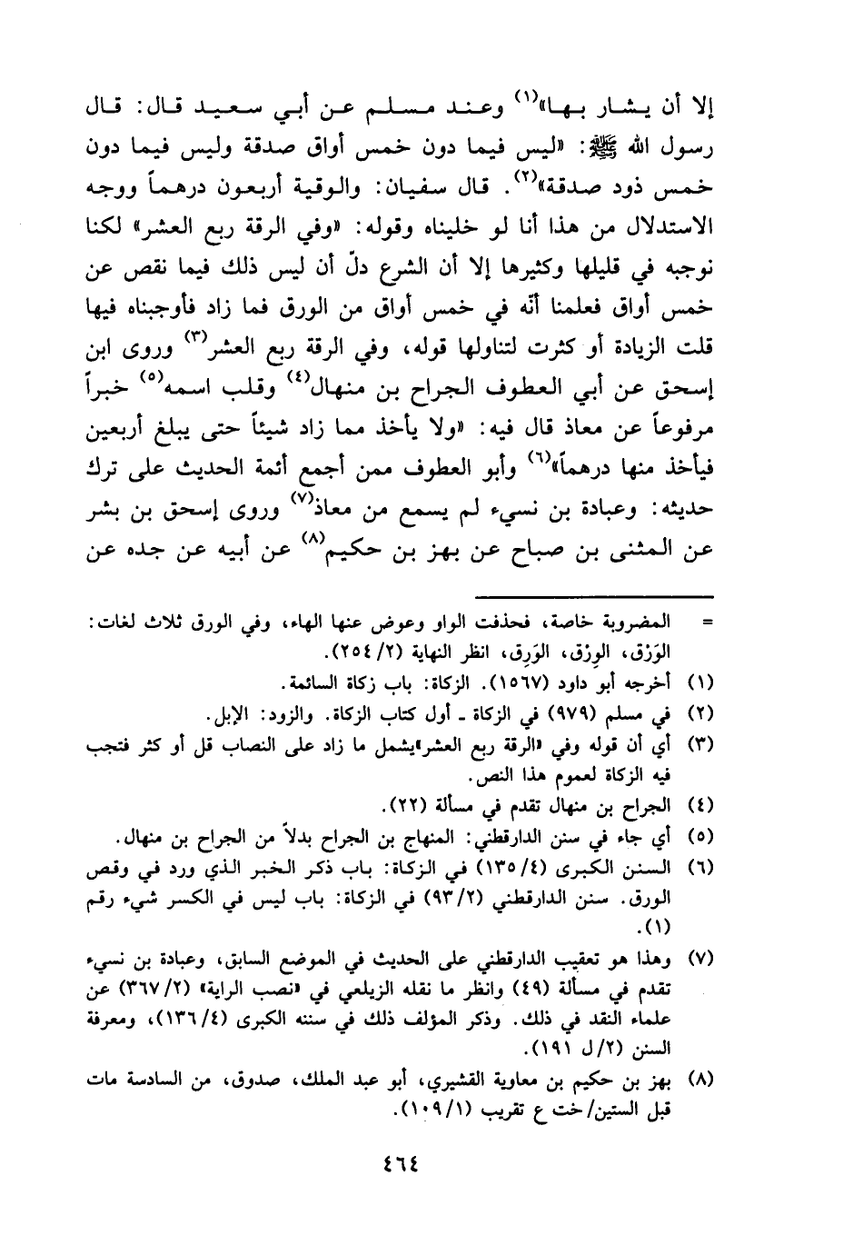 إِلَّا أَن يشار بهَا " وَعند مُسلم عَن أبي سعيد قَالَ: قَالَ رَسُول الله - صَلَّى اللَّهُ عَلَيْهِ وَسَلَّم َ -: " لَيْسَ فِيمَا دون خمس أَوَاقٍ صَدَقَة وَلَيْسَ فِيمَا دون خمس ذود صَدَقَة ". قَالَ سُفْيَان: والوقية أَرْبَعُونَ درهما وَوجه الِاسْتِدْلَال من هَذَا أَنا لَو خليناه وَقَوله: " وَفِي الرقة ربع الْعشْر " لَكنا نوجبه فِي قليلها وكثيرها إِلَّا أَن الشَّرْع دلّ أَن لَيْسَ ذَلِك فِيمَا نقص عَن خمس أَوَاقٍ فَعلمنَا أَنه فِي خمس أَوَاقٍ من الْوَرق فَمَا زَاد فأوجبناه فِيهَا قلت الزِّيَادَة أَو كثرت لتناولها قَوْله، وَفِي الرقة ربع الْعشْر وروى ابْن إِسْحَق عَن أبي العطوف الْجراح بن منهال وقلب اسْمه خَبرا مَرْفُوعا عَن معَاذ قَالَ فِيهِ: " وَلَا يَأْخُذ مِمَّا زَاد شَيْئا حَتَّى يبلغ أَرْبَعِينَ فَيَأْخُذ مِنْهَا درهما " وَأَبُو العطوف مِمَّن أجمع أَئِمَّة الحَدِيث على ترك حَدِيثه: وَعبادَة بن نسيء لم يسمع من معَاذ وروى إِسْحَق بن بشر عَن الْمثنى بن صباح عَن بهز بن حَكِيم عَن أَبِيه عَن جده عَن