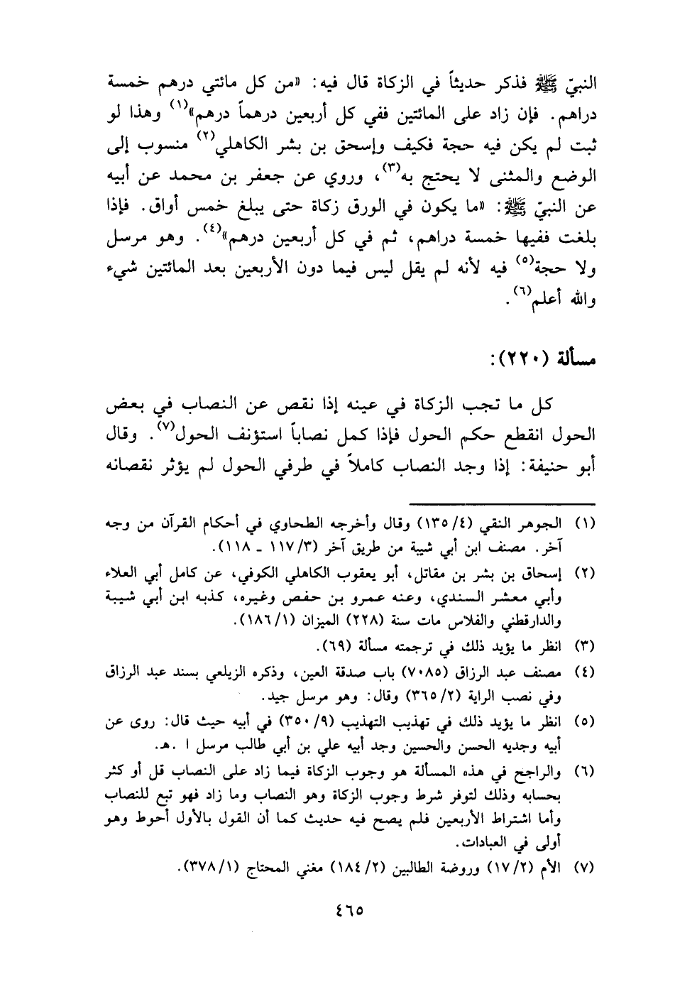 النَّبِي - صَلَّى اللَّهُ عَلَيْهِ وَسَلَّم َ - فَذكر حَدِيثا فِي الزَّكَاة قَالَ فِيهِ: " من كل مِائَتي دِرْهَم خَمْسَة دَرَاهِم. فَإِن زَاد على الْمِائَتَيْنِ فَفِي كل أَرْبَعِينَ درهما دِرْهَم " وَهَذَا لَو ثَبت لم يكن فِيهِ حجَّة فَكيف وَإِسْحَق بن بشر الْكَاهِلِي مَنْسُوب إِلَى الْوَضع والمثنى لَا يحْتَج بِهِ، وَرُوِيَ عَن جَعْفَر بن مُحَمَّد عَن أَبِيه عَن النَّبِي - صَلَّى اللَّهُ عَلَيْهِ وَسَلَّم َ -: " مَا يكون فِي الْوَرق زَكَاة حَتَّى يبلغ خمس أَوَاقٍ. فَإِذا بلغت فَفِيهَا خَمْسَة دَرَاهِم، ثمَّ فِي كل أَرْبَعِينَ دِرْهَم ". وَهُوَ مُرْسل وَلَا حجَّة فِيهِ لِأَنَّهُ لم يقل لَيْسَ فِيمَا دون الْأَرْبَعين بعد الْمِائَتَيْنِ شَيْء وَالله أعلم.