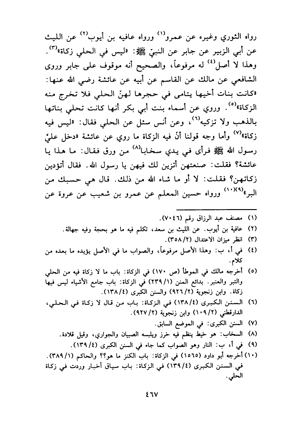 رَوَاهُ الثَّوْريّ وَغَيره عَن عَمْرو وَرَوَاهُ عافيه بن أَيُّوب عَن اللَّيْث عَن أبي الزبير عَن جَابر عَن النَّبِي - صَلَّى اللَّهُ عَلَيْهِ وَسَلَّم َ -: " لَيْسَ فِي الْحلِيّ زَكَاة ". وَهَذَا لَا أصل لَهُ مَرْفُوعا، وَالصَّحِيح أَنه مَوْقُوف على جَابر وروى الشَّافِعِي عَن مَالك عَن الْقَاسِم عَن أَبِيه عَن عَائِشَة رَضِي الله عَنْهَا: " كَانَت بَنَات أَخِيهَا يتامى فِي حجرها لَهُنَّ الْحلِيّ فَلَا تخرج مِنْهُ الزَّكَاة ". وَرُوِيَ عَن أَسمَاء بَيت أبي بكر أَنَّهَا كَانَت تحلي بناتها بِالذَّهَب وَلَا تزكيه، وَعَن أنس سُئِلَ عَن الْحلِيّ فَقَالَ: " لَيْسَ فِيهِ زَكَاة " وَأما وَجه قَوْلنَا أَن فِيهِ الزَّكَاة مَا رُوِيَ عَن عَائِشَة " دخل عَليّ رَسُول الله - صَلَّى اللَّهُ عَلَيْهِ وَسَلَّم َ - فَرَأى فِي يَدي سخابا من ورق فَقَالَ: مَا هَذَا يَا عَائِشَة؟ فَقلت: صنعتهن أتزين لَك فِيهِنَّ يَا رَسُول الله. فَقَالَ أتؤدين زكاتهن؟ فَقلت: لَا أَو مَا شَاءَ الله من ذَلِك. قَالَ هِيَ حَسبك من الْبر " وَرَوَاهُ حُسَيْن الْمعلم عَن عَمْرو بن شُعَيْب عَن عُرْوَة عَن