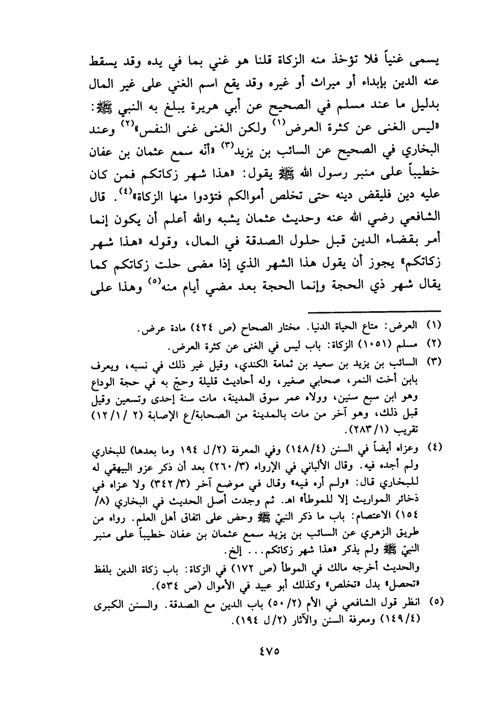 يُسمى غَنِيا فَلَا تُؤْخَذ مِنْهُ الزَّكَاة قُلْنَا هُوَ غَنِي بِمَا فِي يَده وَقد يسْقط عَنهُ الدّين بإبداء أَو مِيرَاث أَو غَيره وَقد يَقع اسْم الْغَنِيّ على غير المَال بِدَلِيل مَا عِنْد مُسلم فِي الصَّحِيح عَن أبي هُرَيْرَة يبلغ بِهِ النَّبِي - صَلَّى اللَّهُ عَلَيْهِ وَسَلَّم َ -: " لَيْسَ الْغَنِيّ عَن كَثْرَة الْعرض وَلَكِن الْغنى غنى النَّفس " وَعند البُخَارِيّ فِي الصَّحِيح عَن السَّائِب بن يزِيد " أَنه سمع عُثْمَان بن عَفَّان خَطِيبًا على مِنْبَر رَسُول الله - صَلَّى اللَّهُ عَلَيْهِ وَسَلَّم َ - يَقُول: " هَذَا شهر زَكَاتكُمْ فَمن كَانَ عَلَيْهِ دين فليقض دينه حَتَّى تخلص أَمْوَالكُم فتؤدوا مِنْهَا الزَّكَاة ". قَالَ الشَّافِعِي رَضِي الله عَنهُ وَحَدِيث عُثْمَان يشبه وَالله أعلم أَن يكون إِنَّمَا أَمر بِقَضَاء الدّين قبل حُلُول الصَّدَقَة فِي المَال، وَقَوله " هَذَا شهر زَكَاتكُمْ " يجوز أَن يَقُول هَذَا الشَّهْر الَّذِي إِذا مضى حلت زَكَاتكُمْ كَمَا يُقَال شهر ذِي الْحجَّة وَإِنَّمَا الْحجَّة بعد مُضِيّ أَيَّام مِنْهُ وَهَذَا على