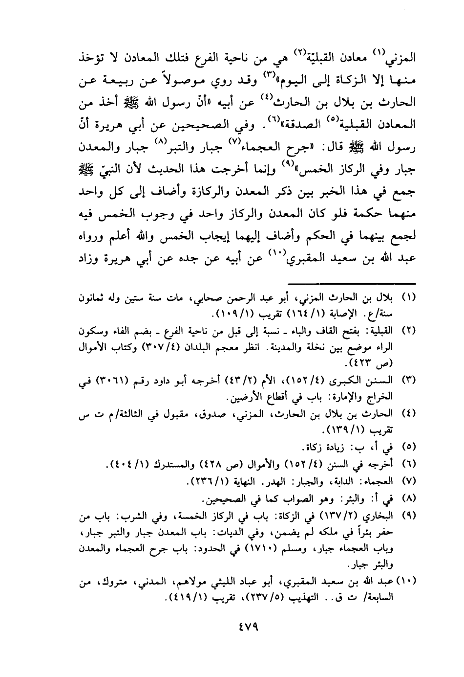 الْمُزنِيّ معادن الْقبلية هِيَ من نَاحيَة الْفَرْع فَتلك الْمَعَادِن لَا تُؤْخَذ مِنْهَا إِلَّا الزَّكَاة إِلَى الْيَوْم " وَقد رُوِيَ مَوْصُولا عَن ربيعَة عَن الْحَارِث بن بِلَال بن الْحَارِث عَن أَبِيه " أَن رَسُول الله - صَلَّى اللَّهُ عَلَيْهِ وَسَلَّم َ - أَخذ من الْمَعَادِن الْقبلية الصَّدَقَة ". وَفِي الصَّحِيحَيْنِ عَن أبي هُرَيْرَة أَن رَسُول الله - صَلَّى اللَّهُ عَلَيْهِ وَسَلَّم َ - قَالَ: " جرح العجماء جَبَّار والتبر جَبَّار والمعدن جَبَّار وَفِي الرِّكَاز الْخمس " وَإِنَّمَا أخرجت هَذَا الحَدِيث لِأَن النَّبِي - صَلَّى اللَّهُ عَلَيْهِ وَسَلَّم َ - جمع فِي هَذَا الْخَبَر بَين ذكر الْمَعْدن والركازة وأضاف إِلَى كل وَاحِد مِنْهُمَا حِكْمَة فَلَو كَانَ الْمَعْدن والركاز وَاحِد فِي وجوب الْخمس فِيهِ لجمع بَينهمَا فِي الحكم وأضاف إِلَيْهِمَا إِيجَاب الْخمس وَالله أعلم وَرَوَاهُ عبد الله بن سعيد المَقْبُري عَن أَبِيه عَن جده عَن أبي هُرَيْرَة وَزَاد