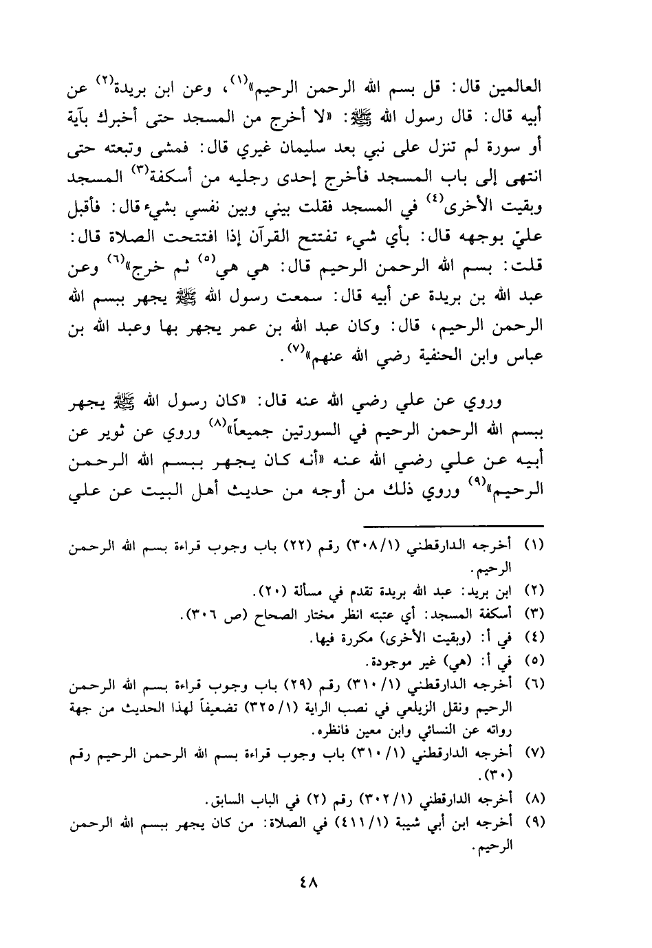 الْعَالمين قَالَ: قل بِسم الله الرَّحْمَن الرَّحِيم "، وَعَن ابْن بُرَيْدَة عَن أَبِيه قَالَ: قَالَ رَسُول الله - صَلَّى اللَّهُ عَلَيْهِ وَسَلَّم َ -: " لَا أخرج من الْمَسْجِد حَتَّى أخْبرك بِآيَة أَو سُورَة لم تنزل على نَبِي بعد سُلَيْمَان غَيْرِي قَالَ: فَمشى وتبعته حَتَّى انْتهى إِلَى بَاب الْمَسْجِد فَأخْرج إِحْدَى رجلَيْهِ من أُسْكُفَّة الْمَسْجِد وَبقيت الْأُخْرَى فِي الْمَسْجِد فَقلت بيني وَبَين نَفسِي بِشَيْء قَالَ: فَأقبل عَليّ بِوَجْهِهِ قَالَ: بِأَيّ شَيْء تفتتح الْقُرْآن إِذا افتتحت الصَّلَاة قَالَ: قلت: بِسم الله الرَّحْمَن الرَّحِيم قَالَ: هِيَ هِيَ ثمَّ خرج " وَعَن عبد الله بن بُرَيْدَة عَن أَبِيه قَالَ: سَمِعت رَسُول الله - صَلَّى اللَّهُ عَلَيْهِ وَسَلَّم َ - يجْهر بِبسْم الله الرَّحْمَن الرَّحِيم، قَالَ: وَكَانَ عبد الله بن عمر يجْهر بهَا وَعبد الله بن عَبَّاس وَابْن الْحَنَفِيَّة رَضِي الله عَنْهُم ".