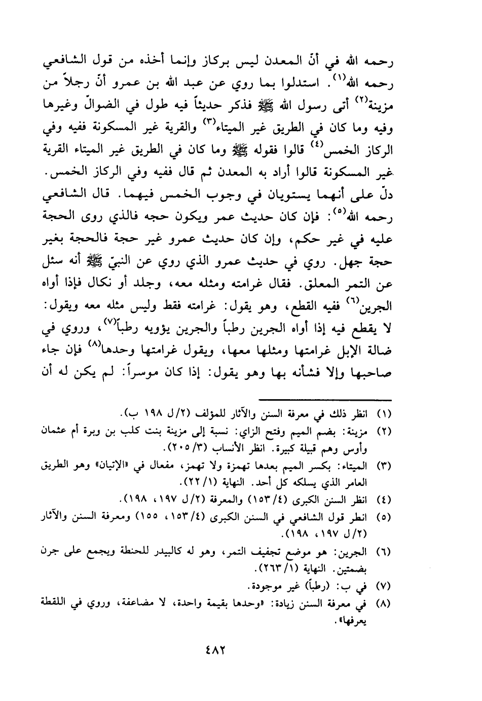 رَحمَه الله فِي أَن الْمَعْدن لَيْسَ بركاز وَإِنَّمَا أَخذه من قَول الشَّافِعِي رَحمَه الله. استدلوا بِمَا رُوِيَ عَن عبد الله بن عَمْرو أَن رجلا من مزينة أَتَى رَسُول الله - صَلَّى اللَّهُ عَلَيْهِ وَسَلَّم َ - فَذكر حَدِيثا فِيهِ طول فِي الضوال وَغَيرهَا وَفِيه وَمَا كَانَ فِي الطَّرِيق غير الميتاء والقرية غير المسكونة فَفِيهِ وَفِي الرِّكَاز الْخمس قَالُوا فَقَوله - صَلَّى اللَّهُ عَلَيْهِ وَسَلَّم َ - وَمَا كَانَ فِي الطَّرِيق غير الميتاء الْقرْيَة غير المسكونة قَالُوا أَرَادَ بِهِ الْمَعْدن ثمَّ قَالَ فَفِيهِ وَفِي الرِّكَاز الْخمس. دلّ على أَنَّهُمَا يستويان فِي وجوب الْخمس فيهمَا. قَالَ الشَّافِعِي رَحمَه الله: فَإِن كَانَ حَدِيث عمر وَيكون حجَّة فَالَّذِي روى الْحجَّة عَلَيْهِ فِي غير حكم، وَإِن كَانَ حَدِيث عَمْرو غير حجَّة فالحجة بِغَيْر حجَّة جهل. رُوِيَ فِي حَدِيث عَمْرو الَّذِي رُوِيَ عَن النَّبِي - صَلَّى اللَّهُ عَلَيْهِ وَسَلَّم َ - أَنه سُئِلَ عَن التَّمْر الْمُعَلق. فَقَالَ غرامته وَمثله مَعَه، وَجلد أَو نكال فَإِذا أَواه الجرين فَفِيهِ الْقطع، وَهُوَ يَقُول: غرامته فَقَط وَلَيْسَ مثله مَعَه وَيَقُول: لَا يقطع فِيهِ إِذا أَواه الجرين رطبا والجرين يؤويه رطبا، وَرُوِيَ فِي ضَالَّة الْإِبِل غرامتها وَمثلهَا مَعهَا، وَيَقُول غرامتها وَحدهَا فَإِن جَاءَ صَاحبهَا وَإِلَّا فَشَأْنه بهَا وَهُوَ يَقُول: إِذا كَانَ مُوسِرًا: لم يكن لَهُ أَن
