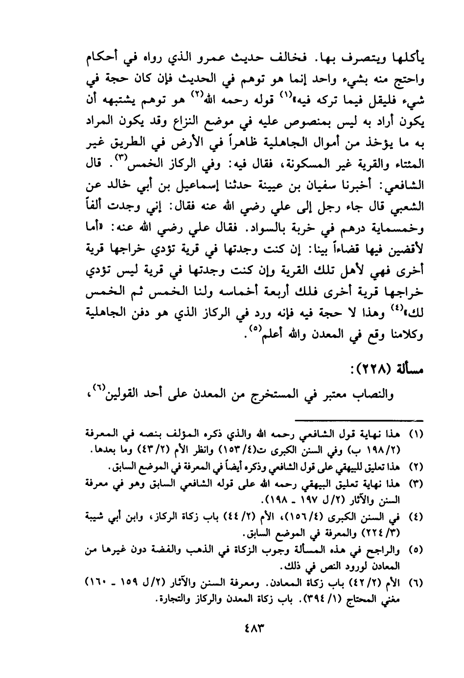 يأكلها ويتصرف بهَا. فَخَالف حَدِيث عَمْرو الَّذِي رَوَاهُ فِي أَحْكَام وَاحْتج مِنْهُ بِشَيْء وَاحِد إِنَّمَا هُوَ توهم فِي الحَدِيث فَإِن كَانَ حجَّة فِي شَيْء فَلْيقل فِيمَا تَركه فِيهِ " قَوْله رَحمَه الله هُوَ توهم يشتبهه أَن يكون أَرَادَ بِهِ لَيْسَ بمنصوص عَلَيْهِ فِي مَوضِع النزاع وَقد يكون المُرَاد بِهِ مَا يُؤْخَذ من أَمْوَال الْجَاهِلِيَّة ظَاهرا فِي الأَرْض فِي الطَّرِيق غير المئتاء والقرية غير المسكونة، فَقَالَ فِيهِ: وَفِي الرِّكَاز الْخمس. قَالَ الشَّافِعِي: أخبرنَا سُفْيَان بن عُيَيْنَة حَدثنَا إِسْمَاعِيل بن أبي خَالِد عَن الشّعبِيّ قَالَ جَاءَ رجل إِلَى عَليّ رَضِي الله عَنهُ فَقَالَ: إِنِّي وجدت ألفا وخمسماية دِرْهَم فِي خربة بِالسَّوَادِ. فَقَالَ عَليّ رَضِي الله عَنهُ: " أما لأقضين فِيهَا قضاءا بَينا: إِن كنت وَجدتهَا فِي قَرْيَة تُؤدِّي خراجها قَرْيَة أُخْرَى فَهِيَ لأهل تِلْكَ الْقرْيَة وَإِن كنت وَجدتهَا فِي قَرْيَة لَيْسَ تُؤدِّي خراجها قَرْيَة أُخْرَى فلك أَرْبَعَة أخماسه وَلنَا الْخمس ثمَّ الْخمس لَك " وَهَذَا لَا حجَّة فِيهِ فَإِنَّهُ ورد فِي الرِّكَاز الَّذِي هُوَ دفن الْجَاهِلِيَّة وكلامنا وَقع فِي الْمَعْدن وَالله أعلم.