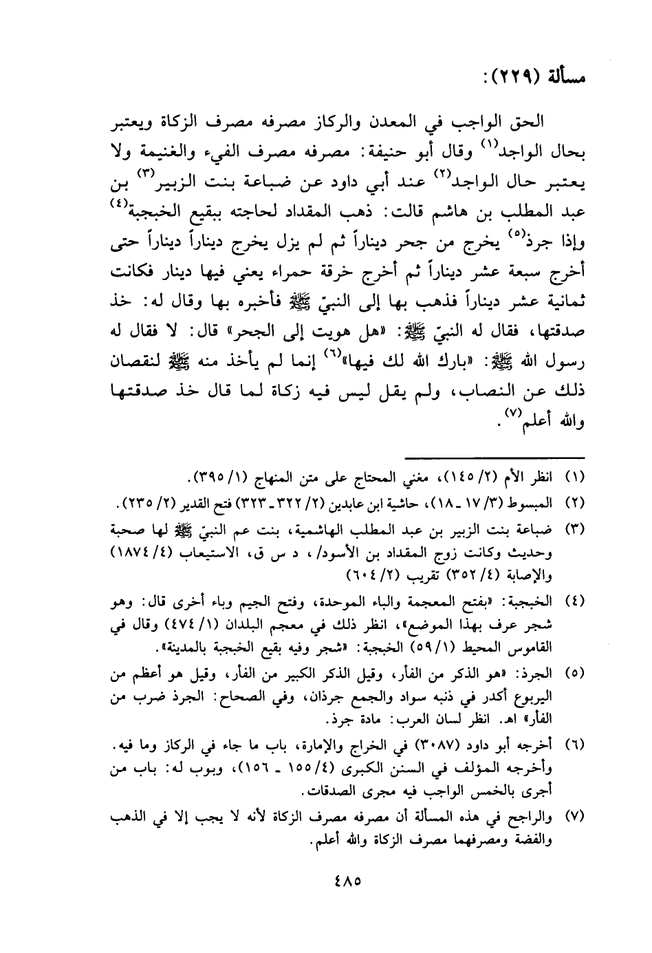 الْحق الْوَاجِب فِي الْمَعْدن والركاز مصرفه مصرف الزَّكَاة وَيعْتَبر بِحَال الْوَاجِد وَقَالَ أَبُو حنيفَة: مصرفه مصرف الْفَيْء وَالْغنيمَة وَلَا يعْتَبر حَال الْوَاجِد عِنْد أبي دَاوُد عَن ضباعة بنت الزبير بن عبد الْمطلب بن هَاشم قَالَت: ذهب الْمِقْدَاد لِحَاجَتِهِ ببقيع الخبجبة وَإِذا جرذ يخرج من حجر دِينَارا ثمَّ لم يزل يخرج دِينَارا دِينَارا حَتَّى أخرج سَبْعَة عشر دِينَارا ثمَّ أخرج خرقَة حَمْرَاء يَعْنِي فِيهَا دِينَار فَكَانَت ثَمَانِيَة عشر دِينَارا فَذهب بهَا إِلَى النَّبِي - صَلَّى اللَّهُ عَلَيْهِ وَسَلَّم َ - فَأخْبرهُ بهَا وَقَالَ لَهُ: خُذ صدقتها، فَقَالَ لَهُ النَّبِي - صَلَّى اللَّهُ عَلَيْهِ وَسَلَّم َ -: " هَل هويت إِلَى الْحجر " قَالَ: لَا فَقَالَ لَهُ رَسُول الله - صَلَّى اللَّهُ عَلَيْهِ وَسَلَّم َ -: " بَارك الله لَك فِيهَا " إِنَّمَا لم يَأْخُذ مِنْهُ - صَلَّى اللَّهُ عَلَيْهِ وَسَلَّم َ - لنُقْصَان ذَلِك عَن النّصاب، وَلم يقل لَيْسَ فِيهِ زَكَاة لما قَالَ خُذ صدقتها وَالله أعلم.