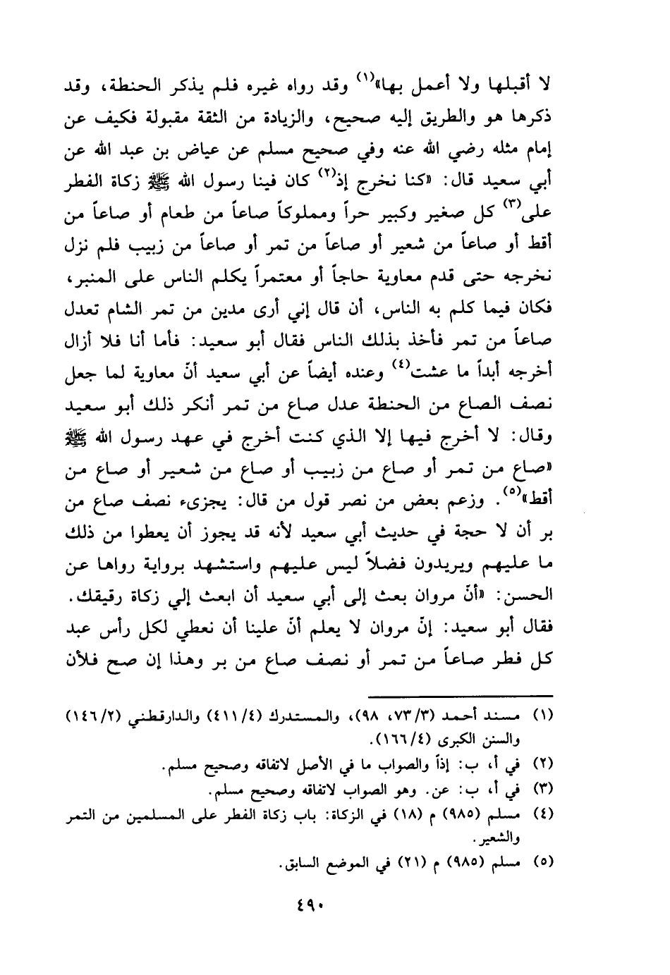 لَا أقبلها وَلَا أعمل بهَا " وَقد رَوَاهُ غَيره فَلم يذكر الْحِنْطَة، وَقد ذكرهَا هُوَ وَالطَّرِيق إِلَيْهِ صَحِيح، وَالزِّيَادَة من الثِّقَة مَقْبُولَة فَكيف عَن إِمَام مثله رَضِي الله عَنهُ وَفِي صَحِيح مُسلم عَن عِيَاض بن عبد الله عَن أبي سعيد قَالَ: " كُنَّا نخرج إِذْ كَانَ فِينَا رَسُول الله - صَلَّى اللَّهُ عَلَيْهِ وَسَلَّم َ - زَكَاة الْفطر على كل صَغِير وكبير حرا ومملوكا صَاعا من طَعَام أَو صَاعا من أقط أَو صَاعا من شعير أَو صَاعا من تمر أَو صَاعا من زبيب فَلم نزل نخرجهُ حَتَّى قدم مُعَاوِيَة حَاجا أَو مُعْتَمِرًا يكلم النَّاس على الْمِنْبَر، فَكَانَ فِيمَا كلم بِهِ النَّاس، أَن قَالَ إِنِّي أرى مَدين من تمر الشَّام تعدل صَاعا من تمر فَأخذ بذلك النَّاس فَقَالَ أَبُو سعيد: فَأَما أَنا فَلَا أَزَال أخرجه أبدا مَا عِشْت وَعِنْده أَيْضا عَن أبي سعيد أَن مُعَاوِيَة لما جعل نصف الصَّاع من الْحِنْطَة عدل صَاع من تمر أنكر ذَلِك أَبُو سعيد وَقَالَ: لَا أخرج فِيهَا إِلَّا الَّذِي كنت أخرج فِي عهد رَسُول الله - صَلَّى اللَّهُ عَلَيْهِ وَسَلَّم َ - " صَاع من تمر أَو صَاع من زبيب أَو صَاع من شعير أَو صَاع من أقط ". وَزعم بعض من نصر قَول من قَالَ: يُجزئ نصف صَاع من بر أَن لَا حجَّة فِي حَدِيث أبي سعيد لِأَنَّهُ قد يجوز أَن يُعْطوا من ذَلِك مَا عَلَيْهِم ويريدون فضلا لَيْسَ عَلَيْهِم وَاسْتشْهدَ بِرِوَايَة رَوَاهَا عَن الْحسن: " أَن مَرْوَان بعث إِلَى أبي سعيد أَن ابْعَثْ إِلَيّ زَكَاة رقيقك. فَقَالَ أَبُو سعيد: إِن مَرْوَان لَا يعلم أَن علينا أَن نعطي لكل رَأس عبد كل فطر صَاعا من تمر أَو نصف صَاع من بر وَهَذَا إِن صَحَّ فَلِأَن