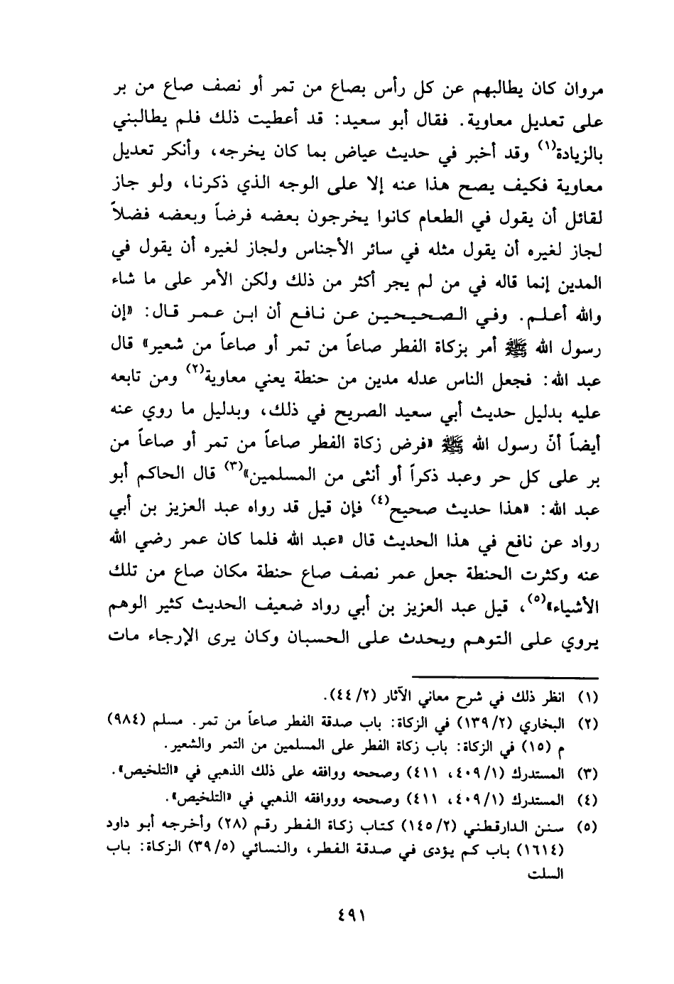 مَرْوَان كَانَ يطالبهم عَن كل رَأس صَاع من تمر أَو نصف صَاع من بر على تَعْدِيل مُعَاوِيَة. فَقَالَ أَبُو سعيد: قد أَعْطَيْت ذَلِك فَلم يطالبني بِالزِّيَادَةِ وَقد أخبر فِي حَدِيث عِيَاض بِمَا كَانَ يُخرجهُ، وَأنكر تَعْدِيل مُعَاوِيَة فَكيف يَصح هَذَا عَنهُ إِلَّا على الْوَجْه الَّذِي ذكرنَا، وَلَو جَازَ لقَائِل أَن يَقُول فِي الطَّعَام كَانُوا يخرجُون بعضه فرضا وَبَعضه فضلا لجَاز لغيره أَن يَقُول مثله فِي سَائِر الْأَجْنَاس ولجاز لغيره أَن يَقُول فِي الْمَدِين إِنَّمَا قَالَه فِي من لم يجز أَكثر من ذَلِك وَلَكِن الْأَمر على مَا شَاءَ وَالله أعلم. وَفِي الصَّحِيحَيْنِ عَن نَافِع أَن ابْن عمر قَالَ: " إِن رَسُول الله - صَلَّى اللَّهُ عَلَيْهِ وَسَلَّم َ - أَمر بِزَكَاة الْفطر صَاعا من تمر أَو صَاعا من شعير " قَالَ عبد الله: فَجعل النَّاس عدله مَدين من حِنْطَة يَعْنِي مُعَاوِيَة وَمن تَابعه عَلَيْهِ بِدَلِيل حَدِيث أبي سعيد الصَّرِيح فِي ذَلِك، وبدليل مَا رُوِيَ عَنهُ أَيْضا أَن رَسُول الله - صَلَّى اللَّهُ عَلَيْهِ وَسَلَّم َ - " فرض زَكَاة الْفطر صَاعا من تمر أَو صَاعا من بر على كل حر وَعبد ذكرا أَو أُنْثَى من الْمُسلمين " قَالَ الْحَاكِم أَبُو عبد الله: " هَذَا حَدِيث صَحِيح فَإِن قيل قد رَوَاهُ عبد الْعَزِيز بن أبي رواد عَن نَافِع فِي هَذَا الحَدِيث قَالَ " عبد الله فَلَمَّا كَانَ عمر رَضِي الله عَنهُ وَكَثُرت الْحِنْطَة جعل عمر نصف صَاع حِنْطَة مَكَان صَاع من تِلْكَ الْأَشْيَاء "، قيل عبد الْعَزِيز بن أبي رواد ضَعِيف الحَدِيث كثير الْوَهم يروي على التَّوَهُّم وَيحدث على الحسبان وَكَانَ يرى الإرجاء مَاتَ