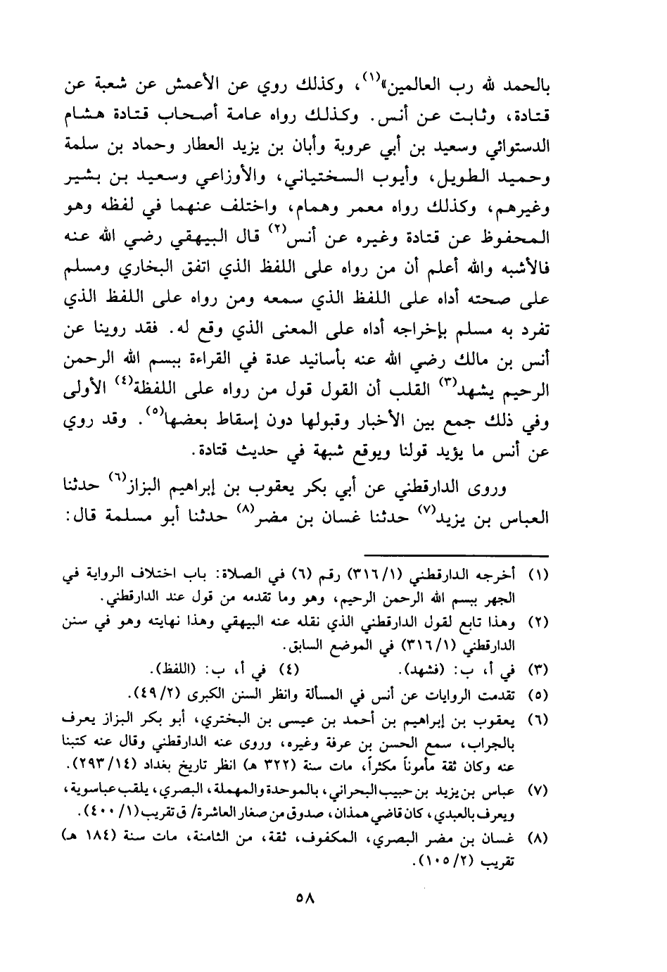 بِالْحَمْد لله رب الْعَالمين "، وَكَذَلِكَ رُوِيَ عَن الْأَعْمَش عَن شُعْبَة عَن قَتَادَة، وثابت عَن أنس. وَكَذَلِكَ رَوَاهُ عَامَّة أَصْحَاب قَتَادَة هِشَام الدستوَائي وَسَعِيد بن أبي عرُوبَة وَأَبَان بن يزِيد الْعَطَّار وَحَمَّاد بن سَلمَة وَحميد الطَّوِيل، وَأَيوب السّخْتِيَانِيّ، وَالْأَوْزَاعِيّ وَسَعِيد بن بشير وَغَيرهم، وَكَذَلِكَ رَوَاهُ معمر وَهَمَّام، وَاخْتلف عَنْهُمَا فِي لَفظه وَهُوَ الْمَحْفُوظ عَن قَتَادَة وَغَيره عَن أنس قَالَ الْبَيْهَقِيّ رَضِي الله عَنهُ فالأشبه وَالله أعلم أَن من رَوَاهُ على اللَّفْظ الَّذِي اتّفق البُخَارِيّ وَمُسلم على صِحَّته أَدَّاهُ على اللَّفْظ الَّذِي سَمعه وَمن رَوَاهُ على اللَّفْظ الَّذِي تفرد بِهِ مُسلم بِإِخْرَاجِهِ أَدَّاهُ على الْمَعْنى الَّذِي وَقع لَهُ. فقد روينَا عَن أنس بن مَالك رَضِي الله عَنهُ بأسانيد عدَّة فِي الْقِرَاءَة بِبسْم الله الرَّحْمَن الرَّحِيم يشْهد الْقلب أَن القَوْل قَول من رَوَاهُ على اللَّفْظَة الأولى وَفِي ذَلِك جمع بَين الْأَخْبَار وقبولها دون إِسْقَاط بَعْضهَا. وَقد رُوِيَ عَن أنس مَا يُؤَيّد قَوْلنَا ويوقع شُبْهَة فِي حَدِيث قَتَادَة.