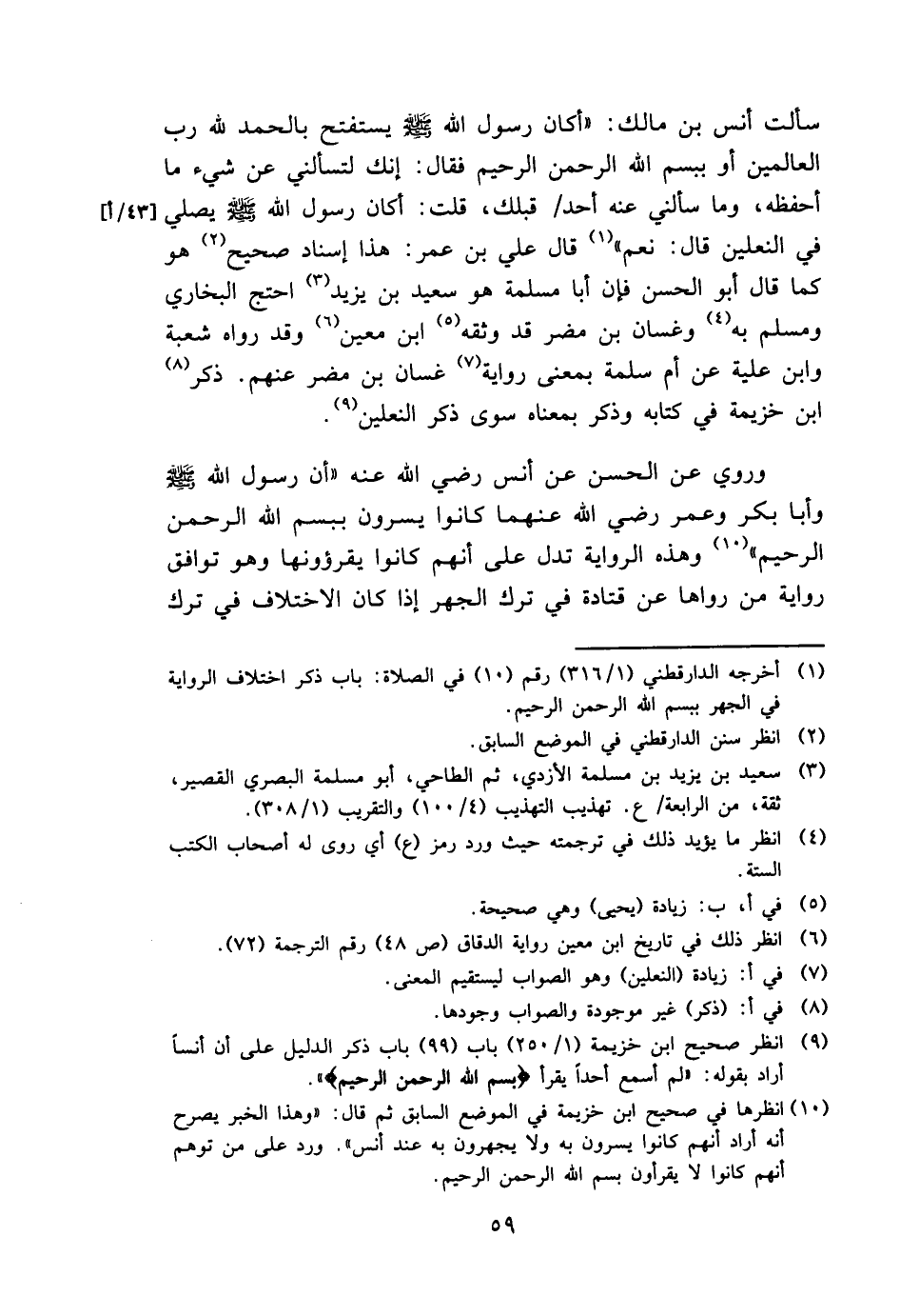 سَأَلت أنس بن مَالك: " أَكَانَ رَسُول الله - صَلَّى اللَّهُ عَلَيْهِ وَسَلَّم َ - يستفتح بِالْحَمْد لله رب الْعَالمين أَو بِبسْم الله الرَّحْمَن الرَّحِيم فَقَالَ: إِنَّك لتسألني عَن شَيْء مَا أحفظه، وَمَا سَأَلَني عَنهُ أحد / قبلك، قلت: أَكَانَ رَسُول الله - صَلَّى اللَّهُ عَلَيْهِ وَسَلَّم َ - يُصَلِّي فِي النَّعْلَيْنِ قَالَ: نعم " قَالَ عَليّ بن عمر: هَذَا إِسْنَاد صَحِيح هُوَ كَمَا قَالَ أَبُو الْحسن فَإِن أَبَا مسلمة هُوَ سعيد بن يزِيد احْتج البُخَارِيّ وَمُسلم بِهِ وغسان بن مُضر قد وَثَّقَهُ ابْن معِين وَقد رَوَاهُ شُعْبَة وَابْن علية عَن أم سَلمَة بِمَعْنى رِوَايَة غَسَّان بن مُضر عَنْهُم. ذكر ابْن خُزَيْمَة فِي كِتَابه وَذكر بِمَعْنَاهُ سوى ذكر النَّعْلَيْنِ.