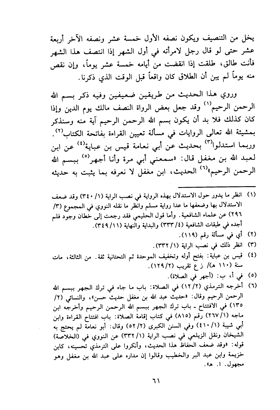 وَرُوِيَ هَذَا الحَدِيث من طَرِيقين ضعيفين وَفِيه ذكر بِسم الله الرَّحْمَن الرَّحِيم وَقد جعل بعض الروَاة النّصْف مَالك يَوْم الدّين وَإِذا كَانَ كَذَلِك فَلَا بُد أَن يكون بِسم الله الرَّحْمَن الرَّحِيم آيه مِنْهُ وَسَنذكر بِمَشِيئَة الله تَعَالَى الرِّوَايَات فِي مَسْأَلَة تعْيين الْقِرَاءَة بِفَاتِحَة الْكتاب. وَرُبمَا استدلوا بِحَدِيث عَن أبي نعَامَة قيس بن عَبَايَة عَن ابْن لعبد الله بن مُغفل قَالَ: " سمعني أبي مرّة وَأَنا أَجْهَر بِبسْم الله الرَّحْمَن الرَّحِيم " الحَدِيث، ابْن مُغفل لَا نعرفه بِمَا يثبت بِهِ حَدِيثه