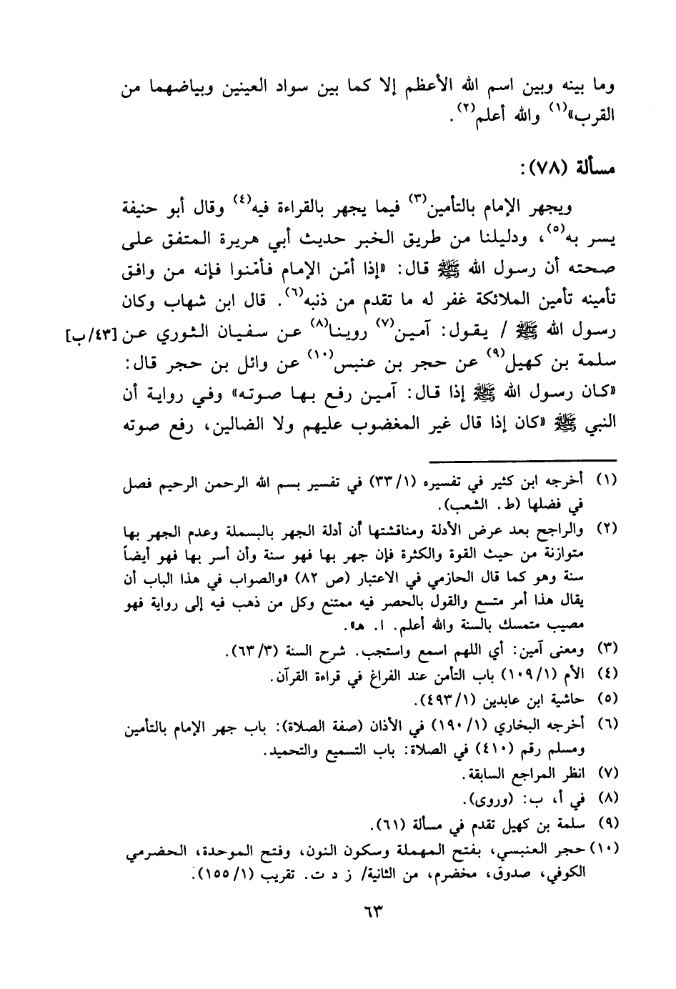 ويجهر الإِمَام بالتأمين فِيمَا يجْهر بِالْقِرَاءَةِ فِيهِ وَقَالَ أَبُو حنيفَة يسر بِهِ، وَدَلِيلنَا من طَرِيق الْخَبَر حَدِيث أبي هُرَيْرَة الْمُتَّفق على صِحَّته أَن رَسُول الله - صَلَّى اللَّهُ عَلَيْهِ وَسَلَّم َ - قَالَ: " إِذا أَمن الإِمَام فَأمنُوا فَإِنَّهُ من وَافق تأمينه تَأْمِين الْمَلَائِكَة غفر لَهُ مَا تقدم من ذَنبه. قَالَ ابْن شهَاب وَكَانَ رَسُول الله - صَلَّى اللَّهُ عَلَيْهِ وَسَلَّم َ - / يَقُول: آمين روينَا عَن سُفْيَان الثَّوْريّ عَن سَلمَة بن كهيل عَن حجر بن عَنْبَس عَن وَائِل بن حجر قَالَ: " كَانَ رَسُول الله - صَلَّى اللَّهُ عَلَيْهِ وَسَلَّم َ - إِذا قَالَ: آمين رفع بهَا صَوته " وَفِي رِوَايَة أَن النَّبِي - صَلَّى اللَّهُ عَلَيْهِ وَسَلَّم َ - " كَانَ إِذا قَالَ غير المغضوب عَلَيْهِم وَلَا الضَّالّين، رفع صَوته