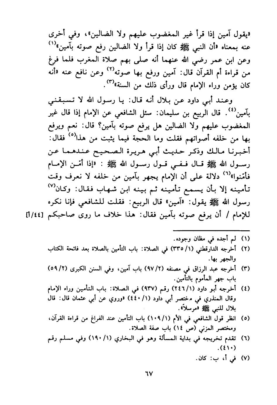 " يَقُول آمين إِذا قَرَأَ غير المغضوب عَلَيْهِم وَلَا الضَّالّين "، وَفِي أُخْرَى عَنهُ بِمَعْنَاهُ " أَن النَّبِي - صَلَّى اللَّهُ عَلَيْهِ وَسَلَّم َ - كَانَ إِذا قَرَأَ وَلَا الضَّالّين رفع صَوته بآمين " وَعَن ابْن عمر رَضِي الله عَنْهُمَا أَنه صلى بهم صَلَاة الْمغرب فَلَمَّا فرغ من قِرَاءَة أم الْقُرْآن قَالَ: آمين وَرفع بهَا صَوته وَعَن نَافِع عَنهُ " أَنه كَانَ يُؤمن وَرَاء الإِمَام قَالَ وَرَأى ذَلِك من السّنة ".