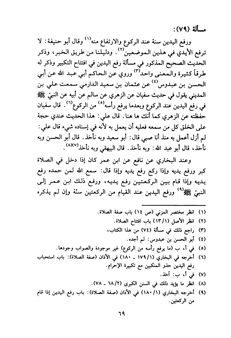 وَرفع الْيَدَيْنِ سنة عِنْد الرُّكُوع والارتفاع مِنْهُ وَقَالَ أَبُو حنيفَة: لَا ترفع الْأَيْدِي فِي هذَيْن الْمَوْضِعَيْنِ. وَدَلِيلنَا من طَرِيق الْخَبَر، وَذكر الحَدِيث الصَّحِيح الْمَذْكُور فِي مَسْأَلَة رفع الْيَدَيْنِ فِي افْتِتَاح التَّكْبِير وَذكر لَهُ طرقا كَثِيرَة وَالْمعْنَى وَاحِد وَرُوِيَ عَن الْحَاكِم أبي عبد الله عَن أبي الْحسن بن عَبدُوس عَن عُثْمَان بن سعيد الدَّارمِيّ سَمِعت عَليّ بن الْمَدِينِيّ يَقُول فِي حَدِيث سُفْيَان عَن الزُّهْرِيّ عَن سَالم عَن أَبِيه عَن النَّبِي - صَلَّى اللَّهُ عَلَيْهِ وَسَلَّم َ - فِي رفع الْيَدَيْنِ عِنْد الرُّكُوع وَبَعْدَمَا يرفع رَأسه من الرُّكُوع. قَالَ سُفْيَان حفظته عَن الزُّهْرِيّ كَمَا أَنَّك هَا هُنَا. قَالَ عَليّ: هَذَا الحَدِيث عِنْدِي حجَّة على الْخلق كل من سَمعه فَعَلَيهِ أَن يعْمل بِهِ لِأَنَّهُ فِي إِسْنَاده شَيْء قَالَ عَليّ: لم أزل أعمل بِهِ مُنْذُ أَنا صبي قَالَ: أَبُو سعيد وَبِه نَأْخُذ. قَالَ أَبُو الْحسن وَبِه نَأْخُذ، قَالَ أَبُو عبد الله: وَبِه نَأْخُذ. قَالَ الْبَيْهَقِيّ وَبِه نَأْخُذ.