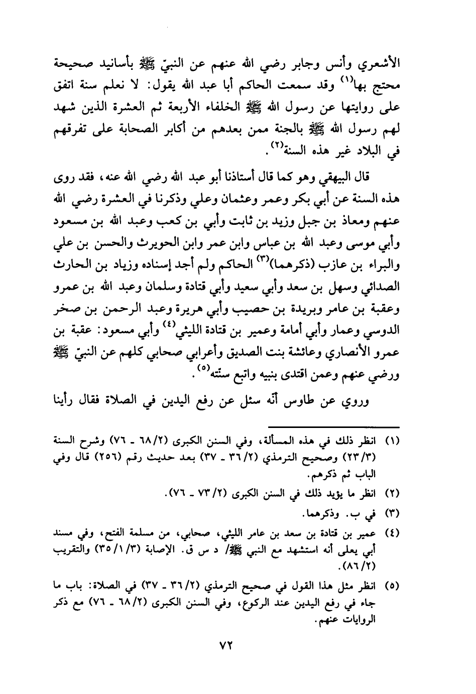 الْأَشْعَرِيّ وَأنس وَجَابِر رَضِي الله عَنْهُم عَن النَّبِي - صَلَّى اللَّهُ عَلَيْهِ وَسَلَّم َ - بأسانيد صَحِيحَة مُحْتَج بهَا وَقد سَمِعت الْحَاكِم أَبَا عبد الله يَقُول: لَا نعلم سنة اتّفق على رِوَايَتهَا عَن رَسُول الله - صَلَّى اللَّهُ عَلَيْهِ وَسَلَّم َ - الْخُلَفَاء الْأَرْبَعَة ثمَّ الْعشْرَة الَّذين شهد لَهُم رَسُول الله - صَلَّى اللَّهُ عَلَيْهِ وَسَلَّم َ - بِالْجنَّةِ مِمَّن بعدهمْ من أكَابِر الصَّحَابَة على تفرقهم فِي الْبِلَاد غير هَذِه السّنة.